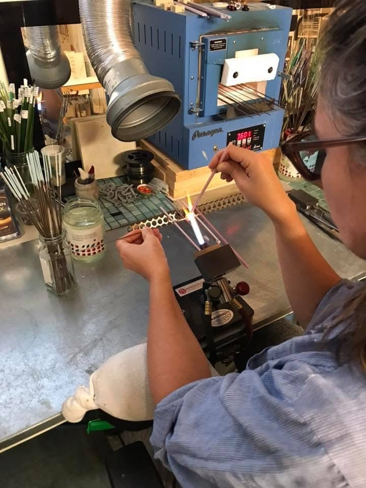 Pärlorna i mina smycken skapar jag själv över öppen flamma med lampworkteknik. Glasstavar smälts och formas till unika pärlor, var och en med sitt eget uttryck och karaktär.