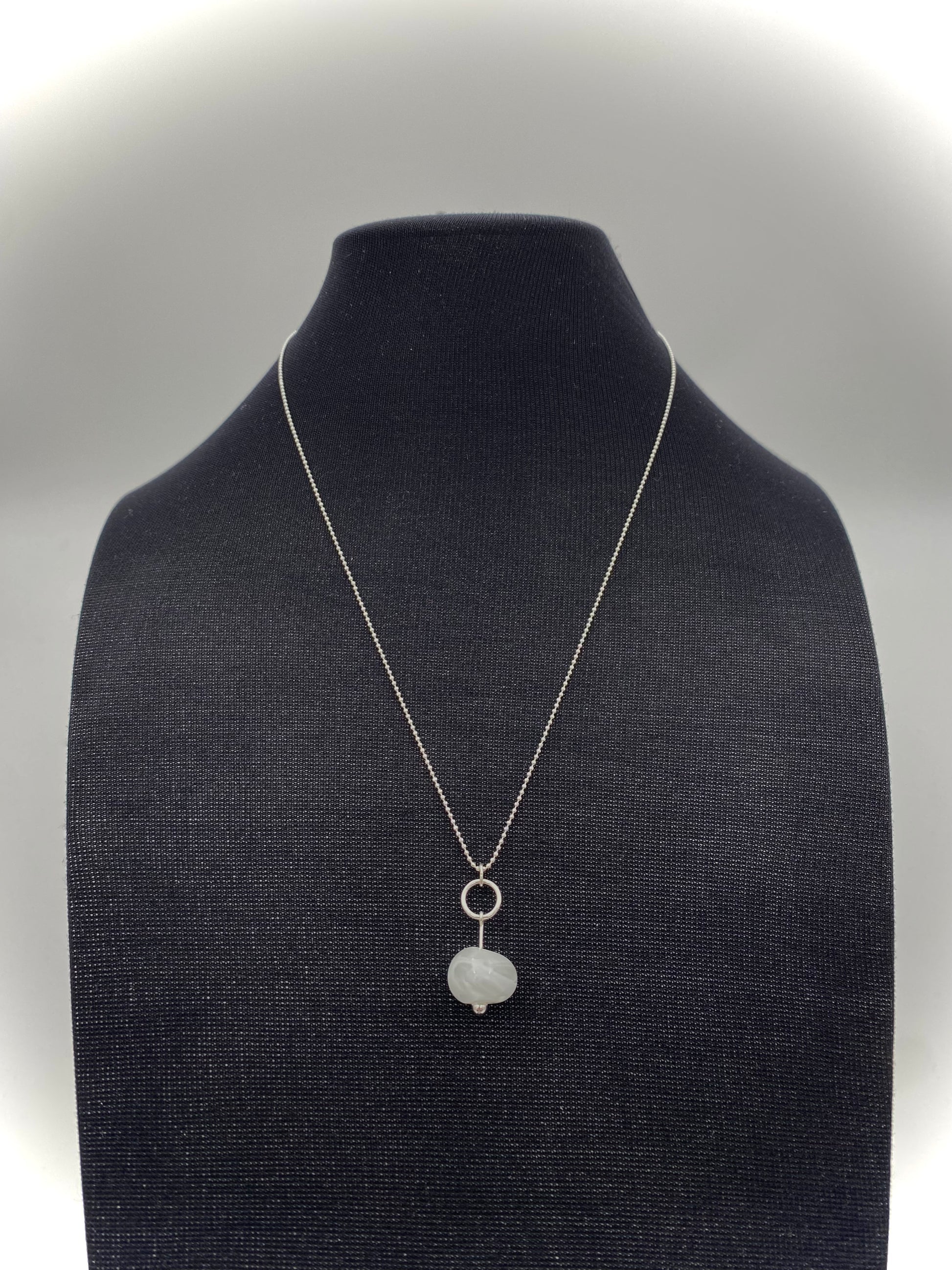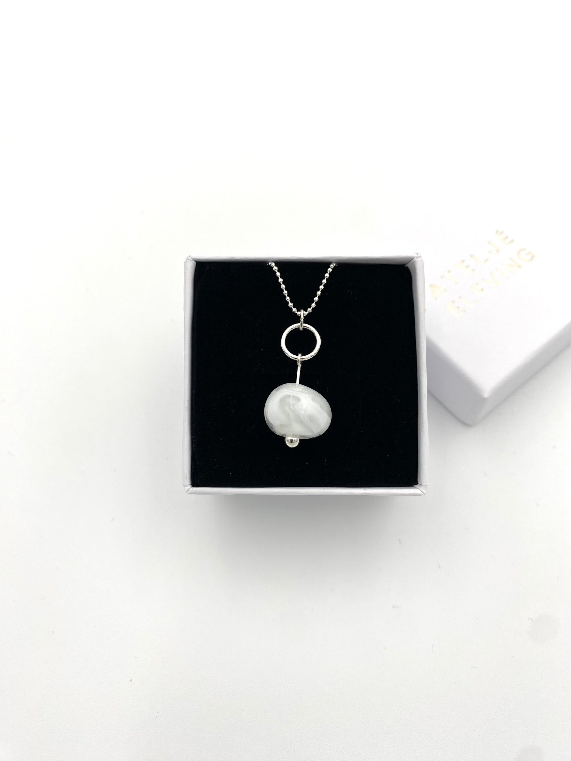 Vit melerad glaspärla. Själva hänget är 2.5 cm långt. Pärlan i sig är 1x1 cm. Levereras med en facetterad 1 mm kulkedja med lås 45 cm sterling silver i smyckesask.