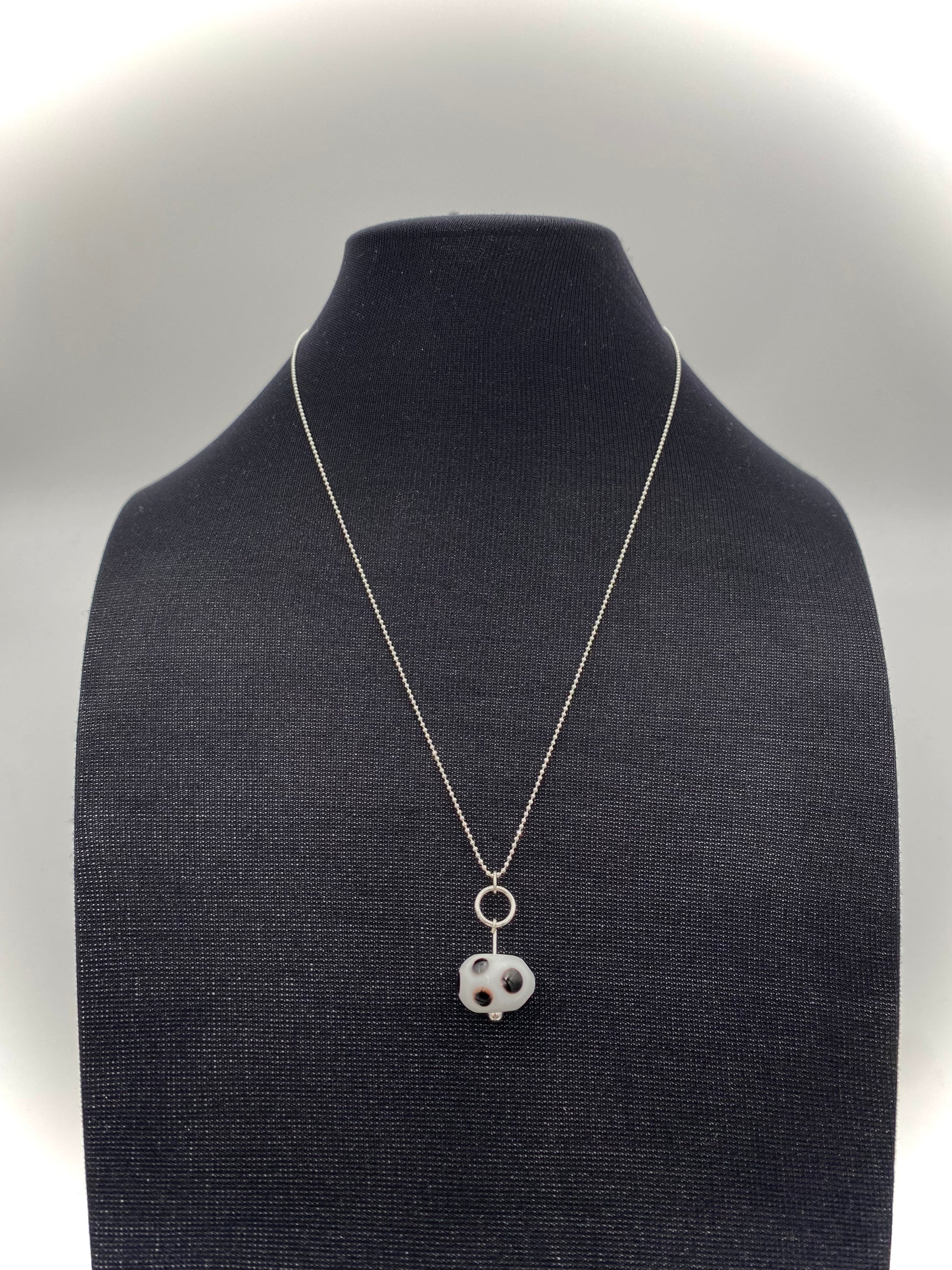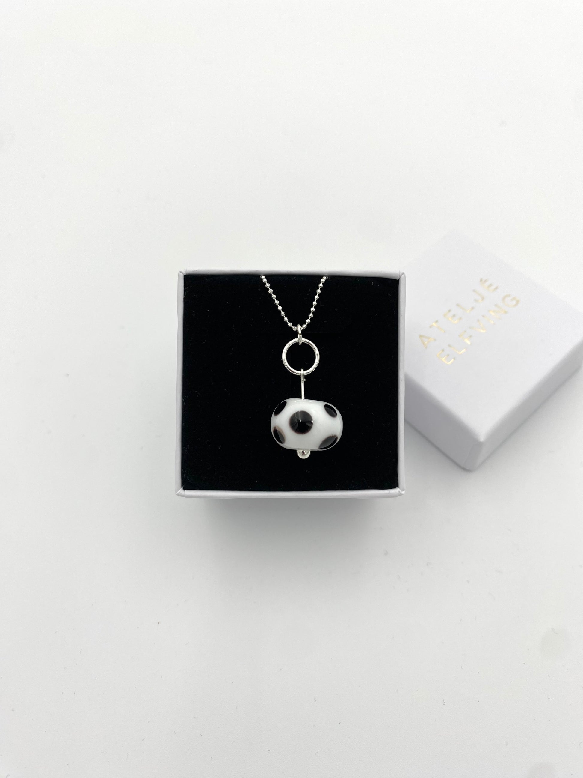 Vit och svartprickig glaspärla. Själva hänget är 2.5 cm långt. Pärlan i sig är 1.5 x1 cm. Levereras med en facetterad 1 mm kulkedja med lås 45 cm sterling silver i smyckesask.