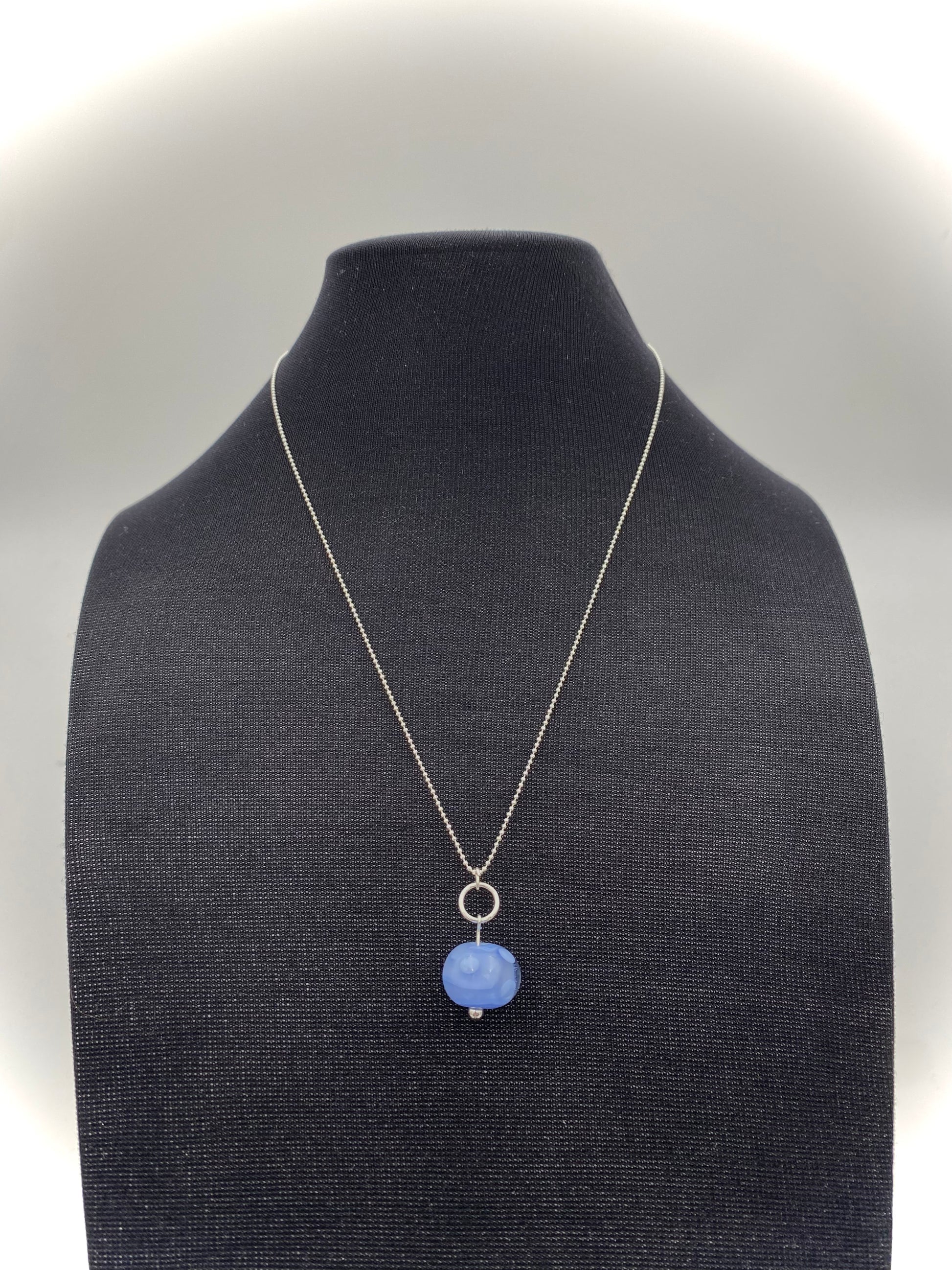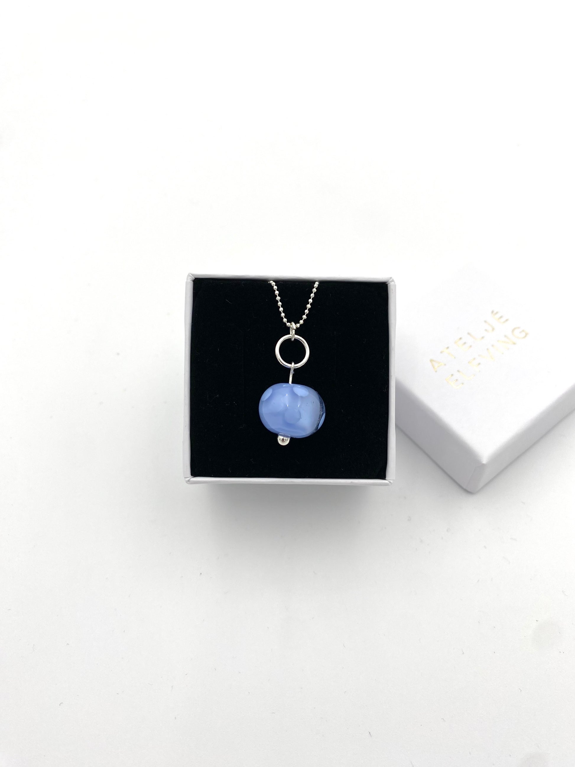 Ljusblå glaspärla med klarglas och ljusblåa prickar. Själva hänget är 2.5 cm långt. Pärlan i sig är 1.5x1 cm. Levereras med en facetterad 1 mm kulkedja med lås 45 cm sterling silver i smyckesask.