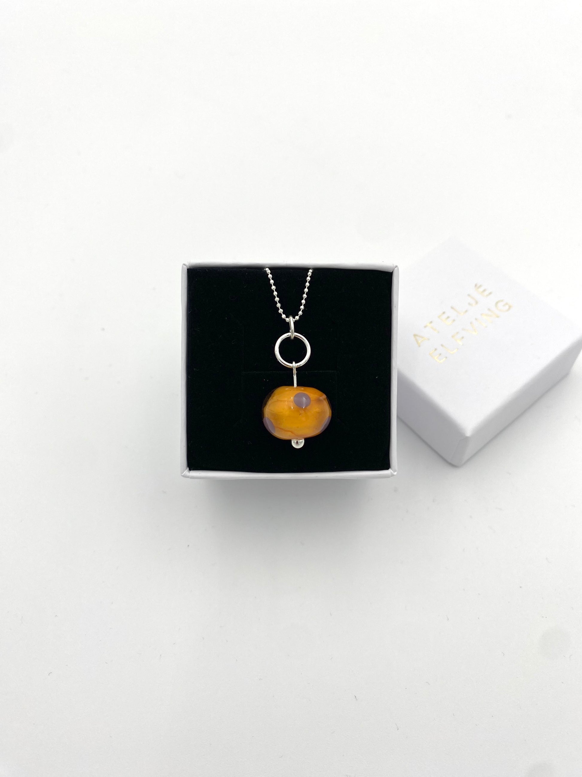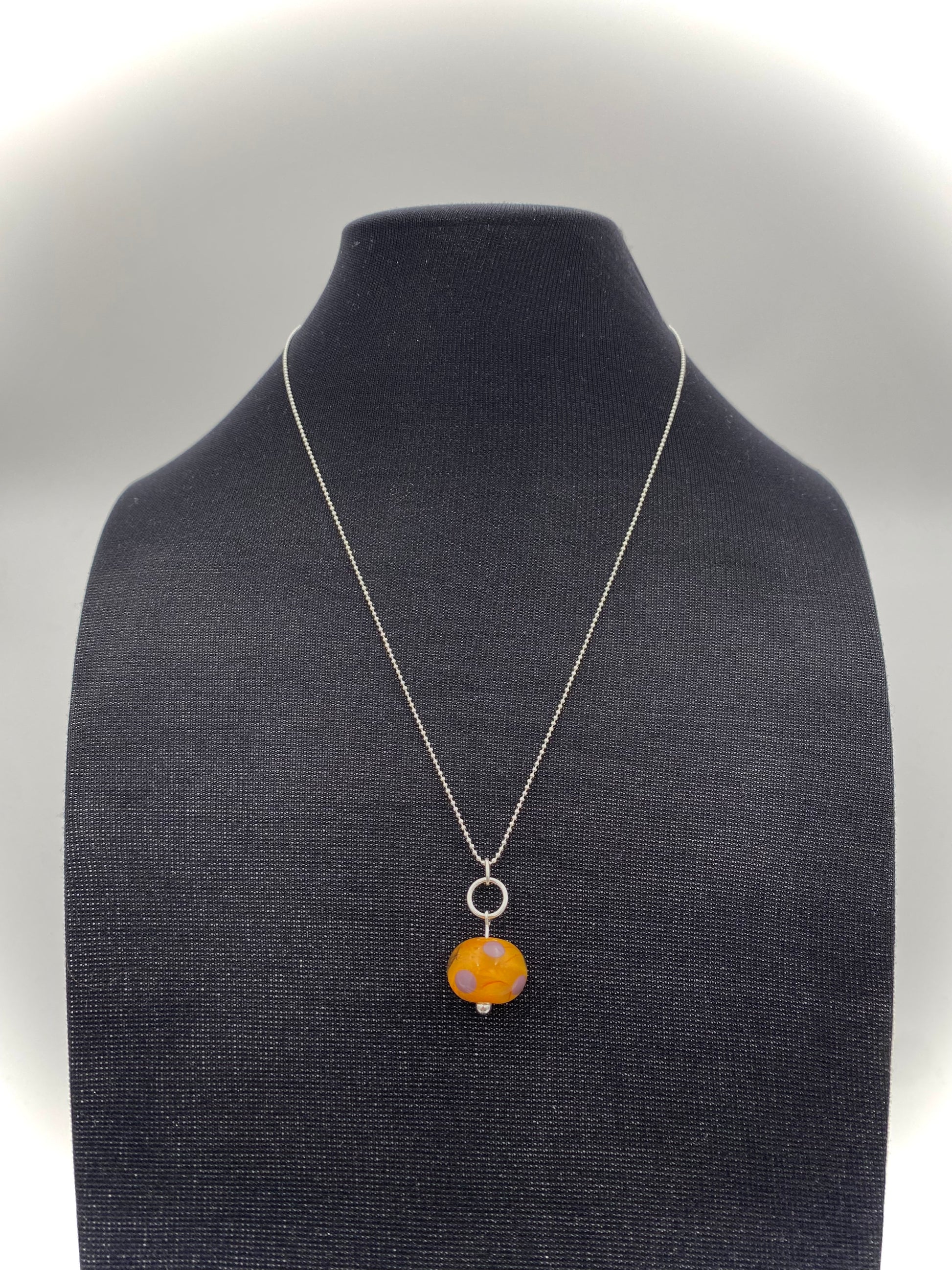 Orange glaspärla med klarglas och lila prickar. Själva hänget är 2.5 cm långt. Pärlan i sig är 1.5x1 cm. Levereras med en facetterad 1 mm kulkedja med lås 45 cm sterling silver i smyckesask.