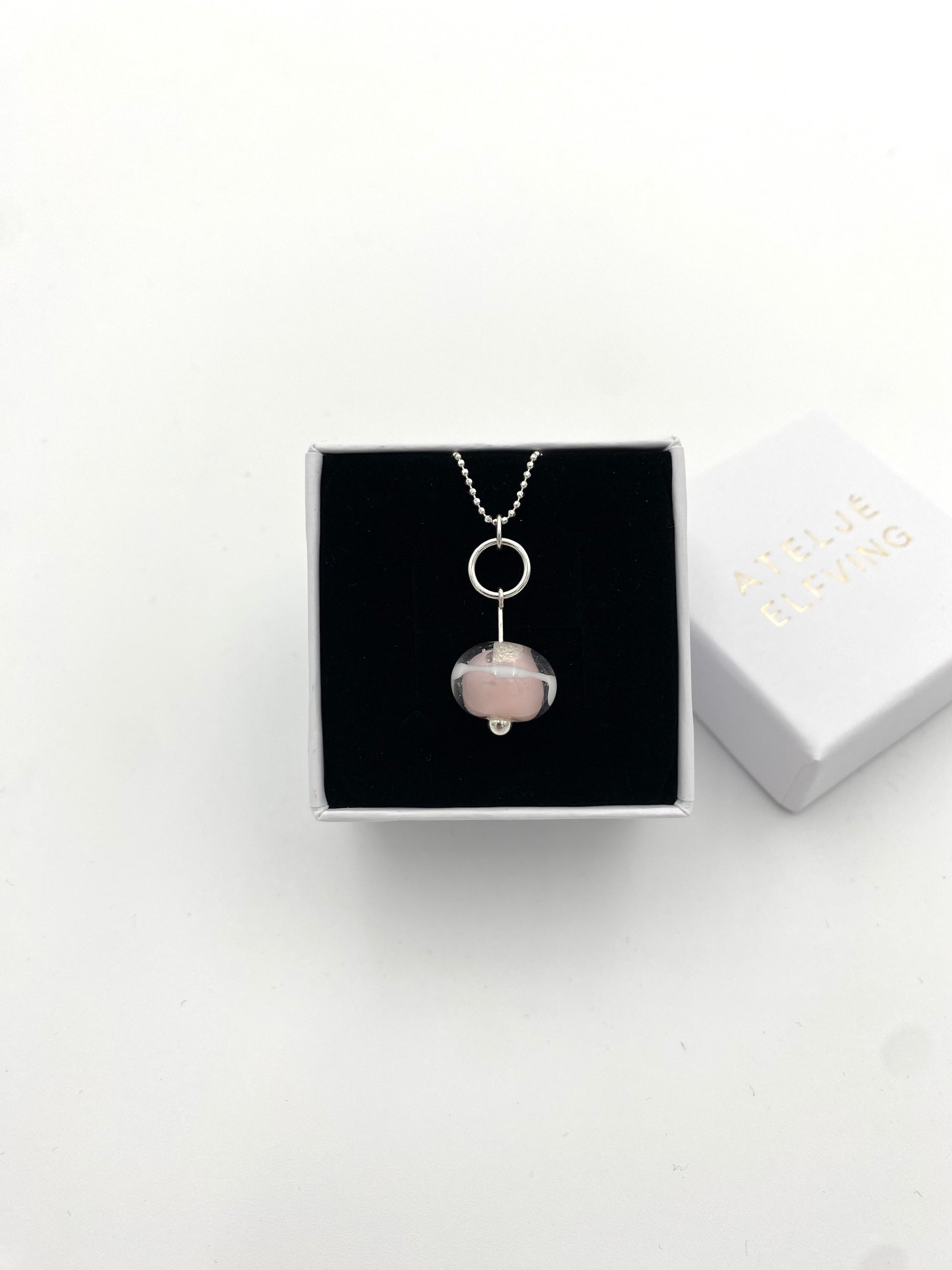 Ljusrosa melerad glaspärla med klarglas och vit rand. Själva hänget är 2.5 cm långt. Pärlan i sig är 1x1 cm. Levereras med en facetterad 1 mm kulkedja med lås 45 cm sterling silver i smyckesask.