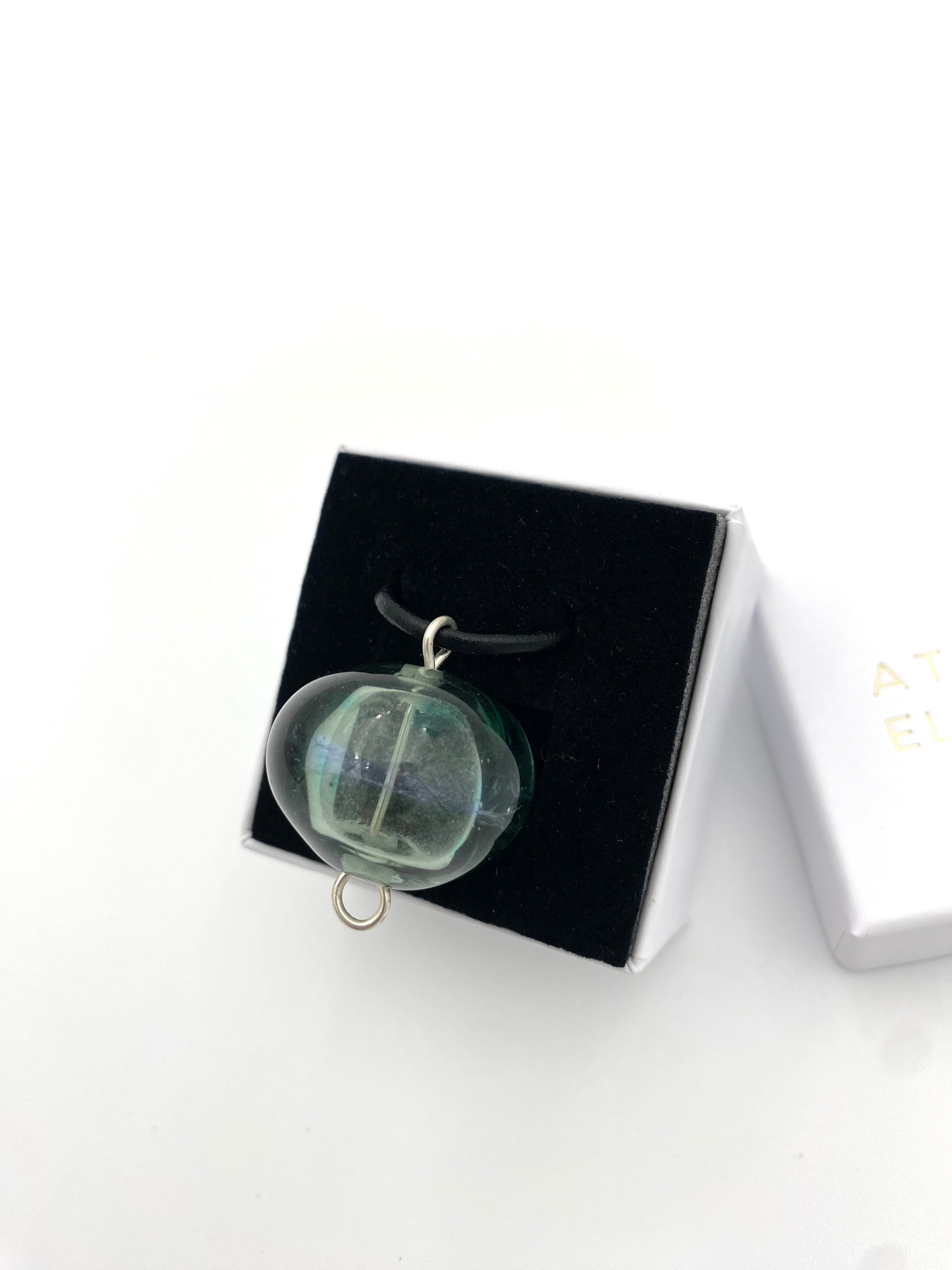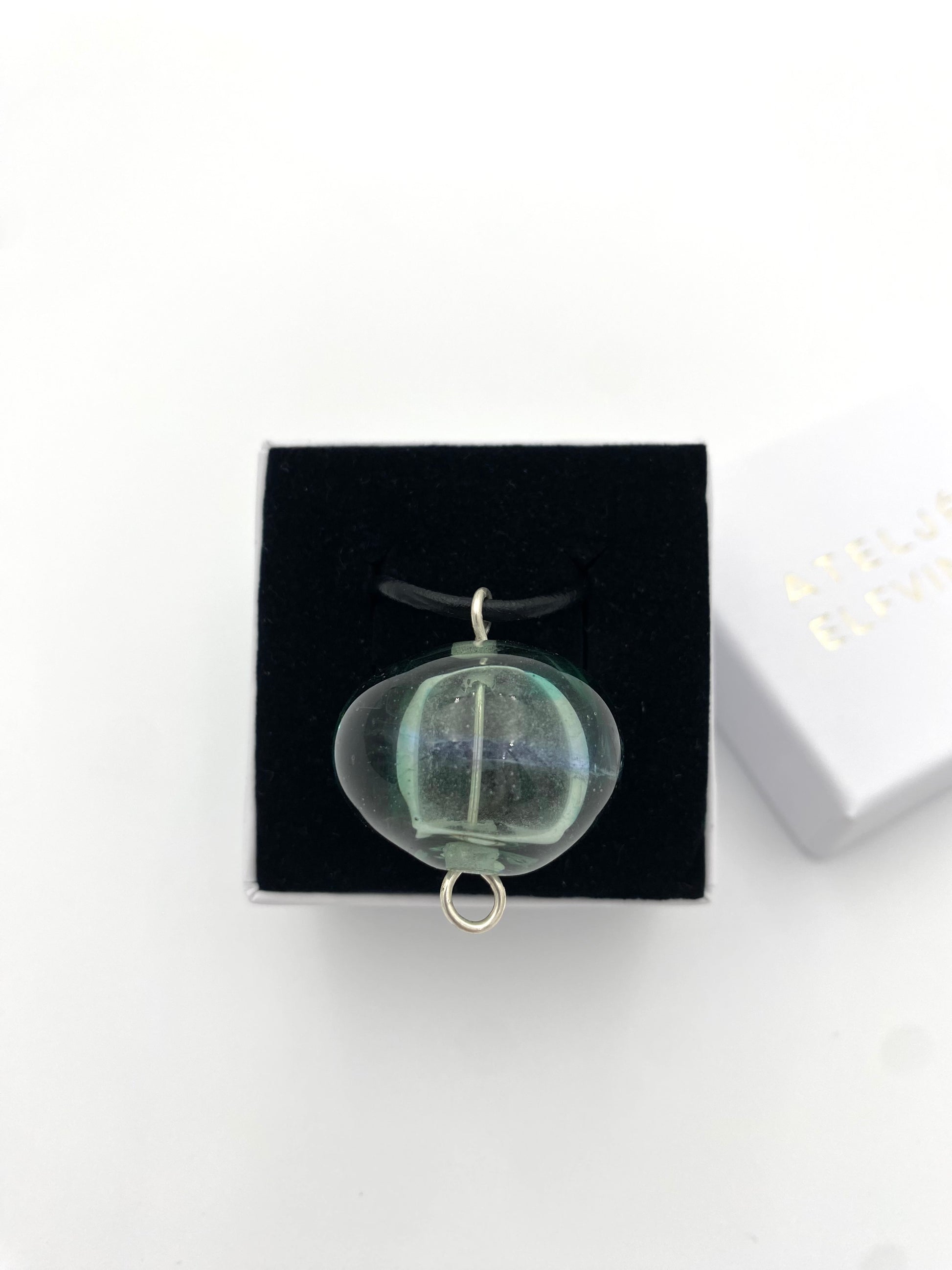 Dimgrön ihålig "ballongpärla". 3 cm. hög, 2,5 cm. bred. Levereras med läderrem.