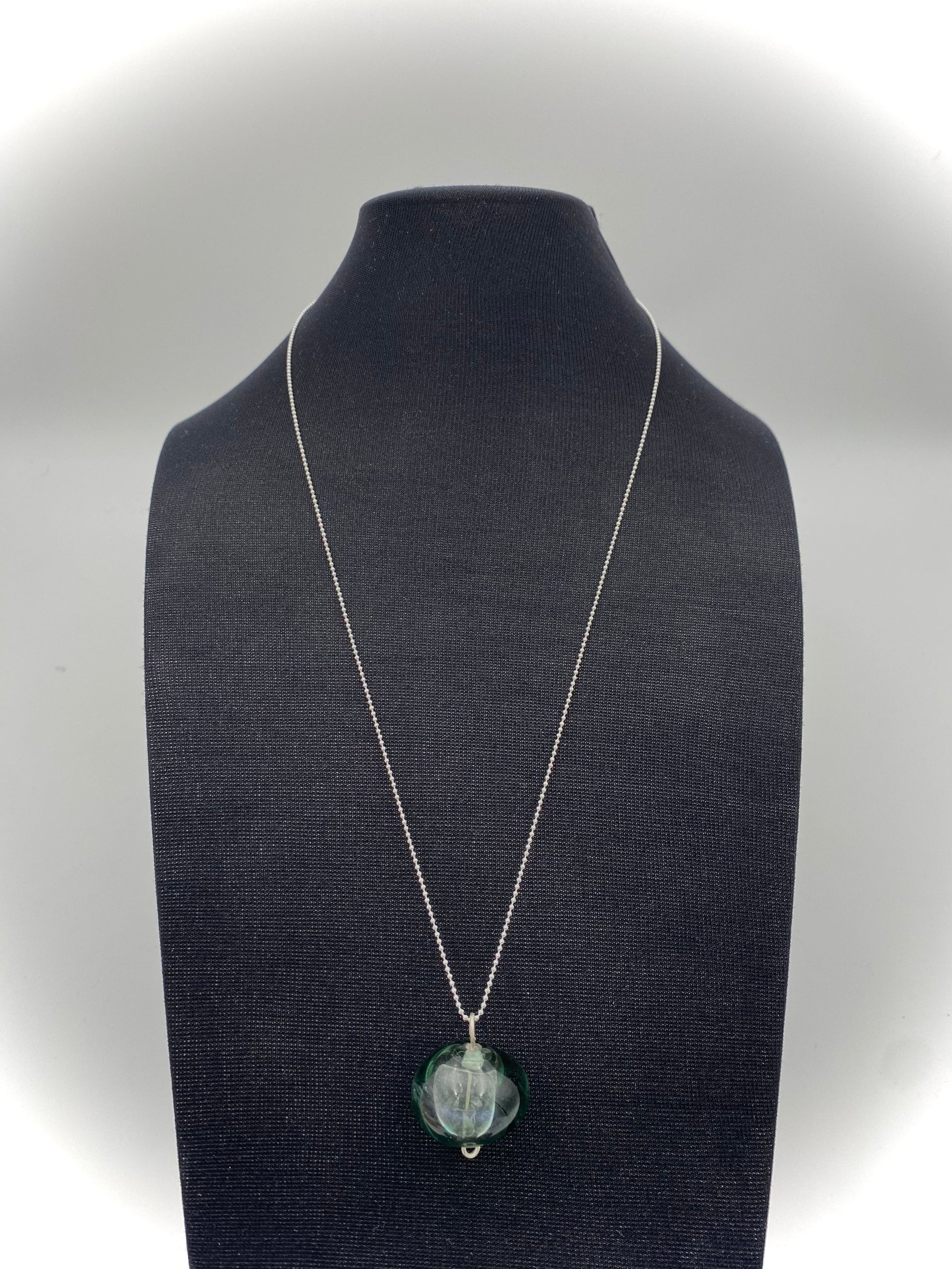 Dimgrön ihålig "ballongpärla". 3 cm. hög, 2,5 cm. bred. 1.2 mm kulkedja med lås 60 cm sterling silver medföljer. Levereras i smyckesask.