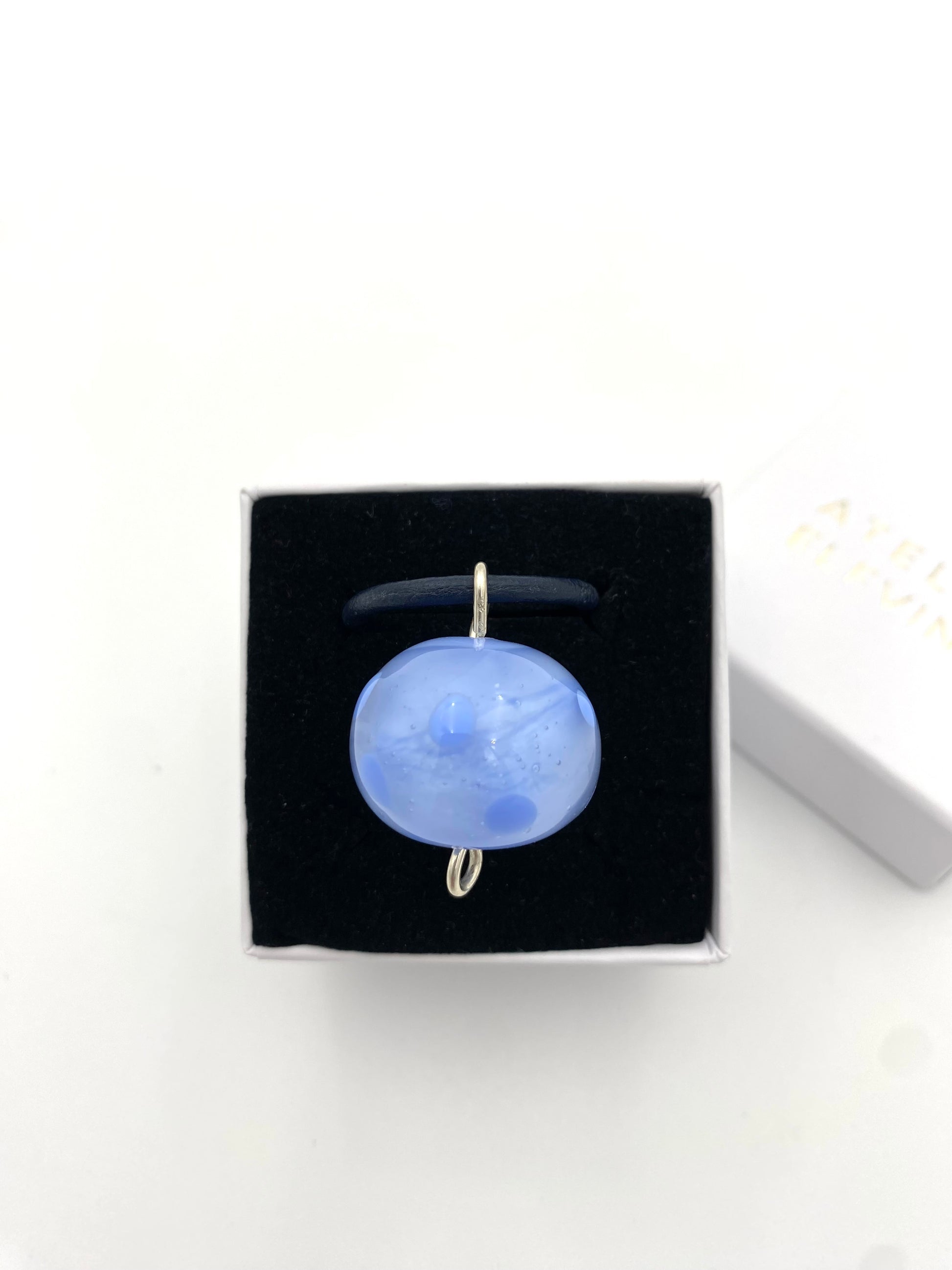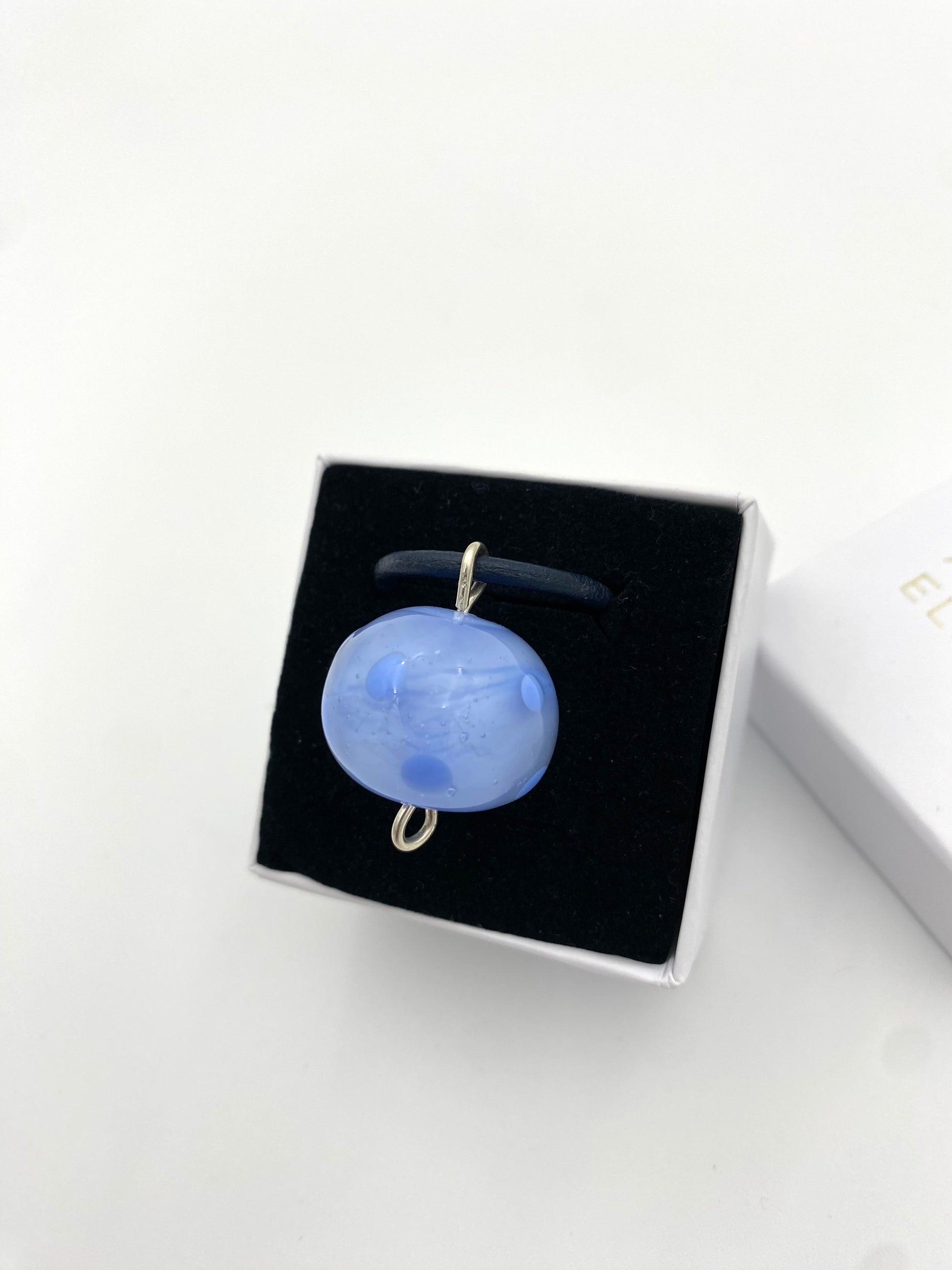 Ljusblå pärla med klarglas och ljusblåa prickar. 3 cm. hög, 2 cm. bred. Levereras med läderrem.