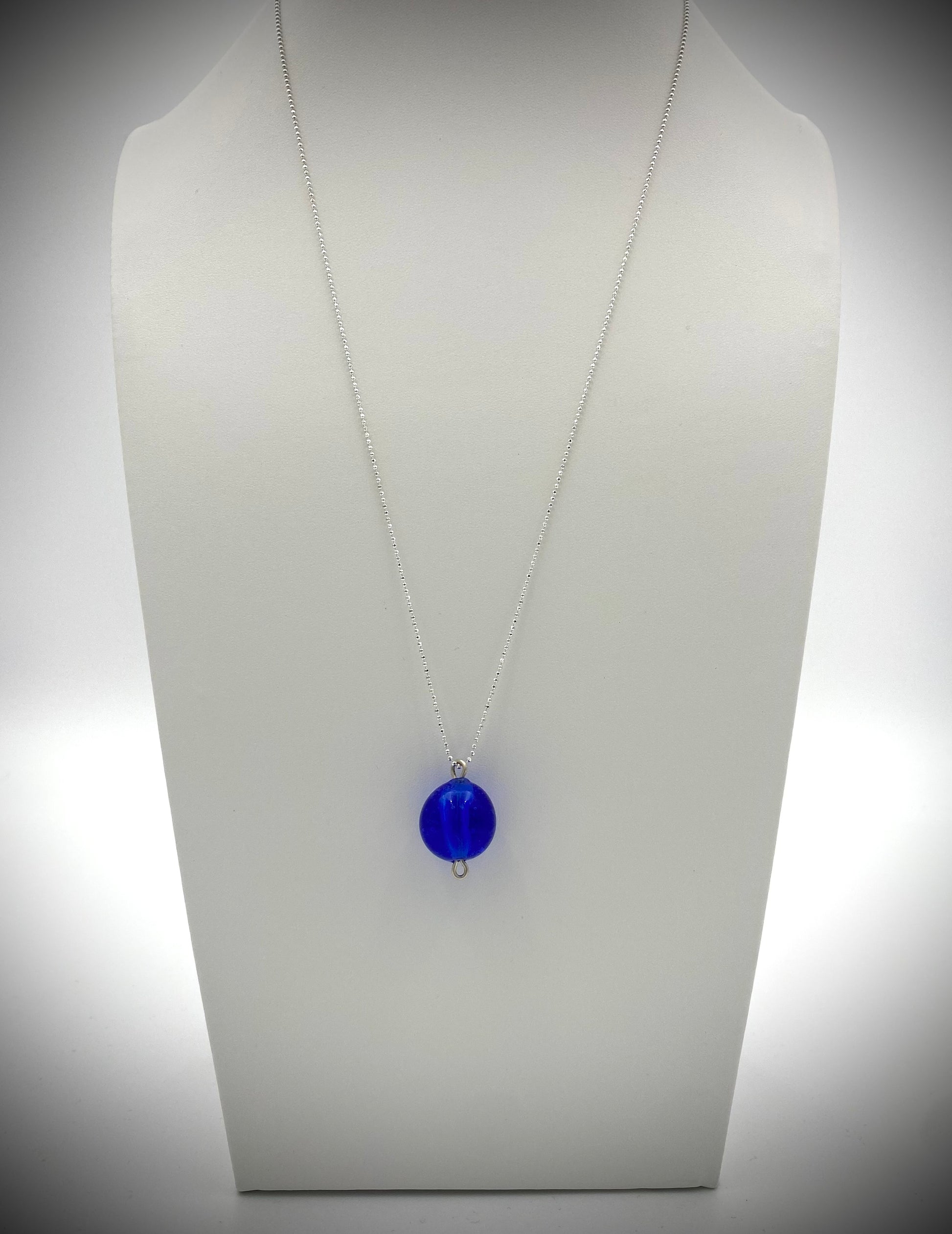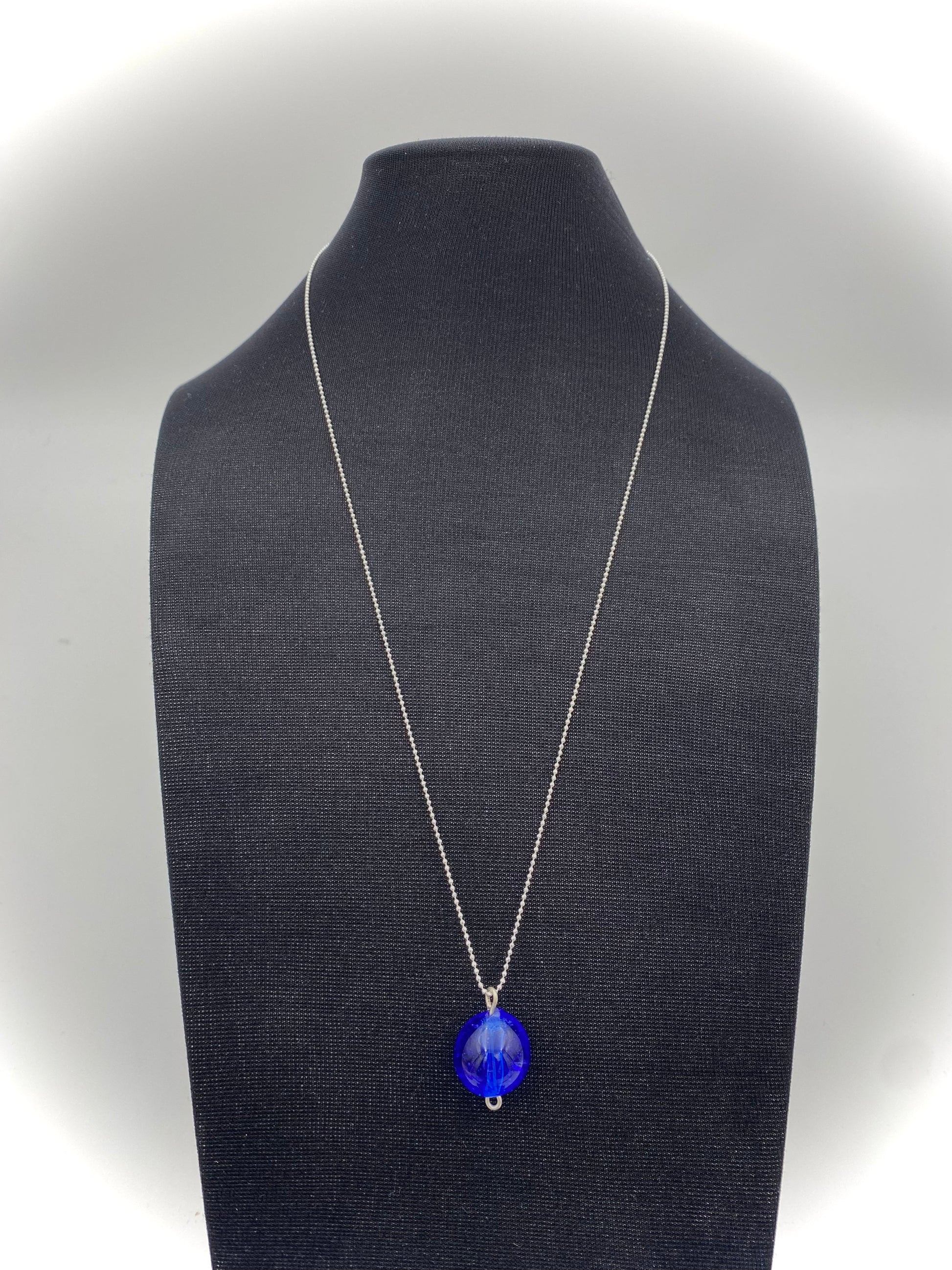 Klarblå ihålig "ballongpärla". 2.5 cm. hög, 1,5 cm. bred. 1.2 mm kulkedja med lås 60 cm sterling silver medföljer. Levereras i smyckesask.