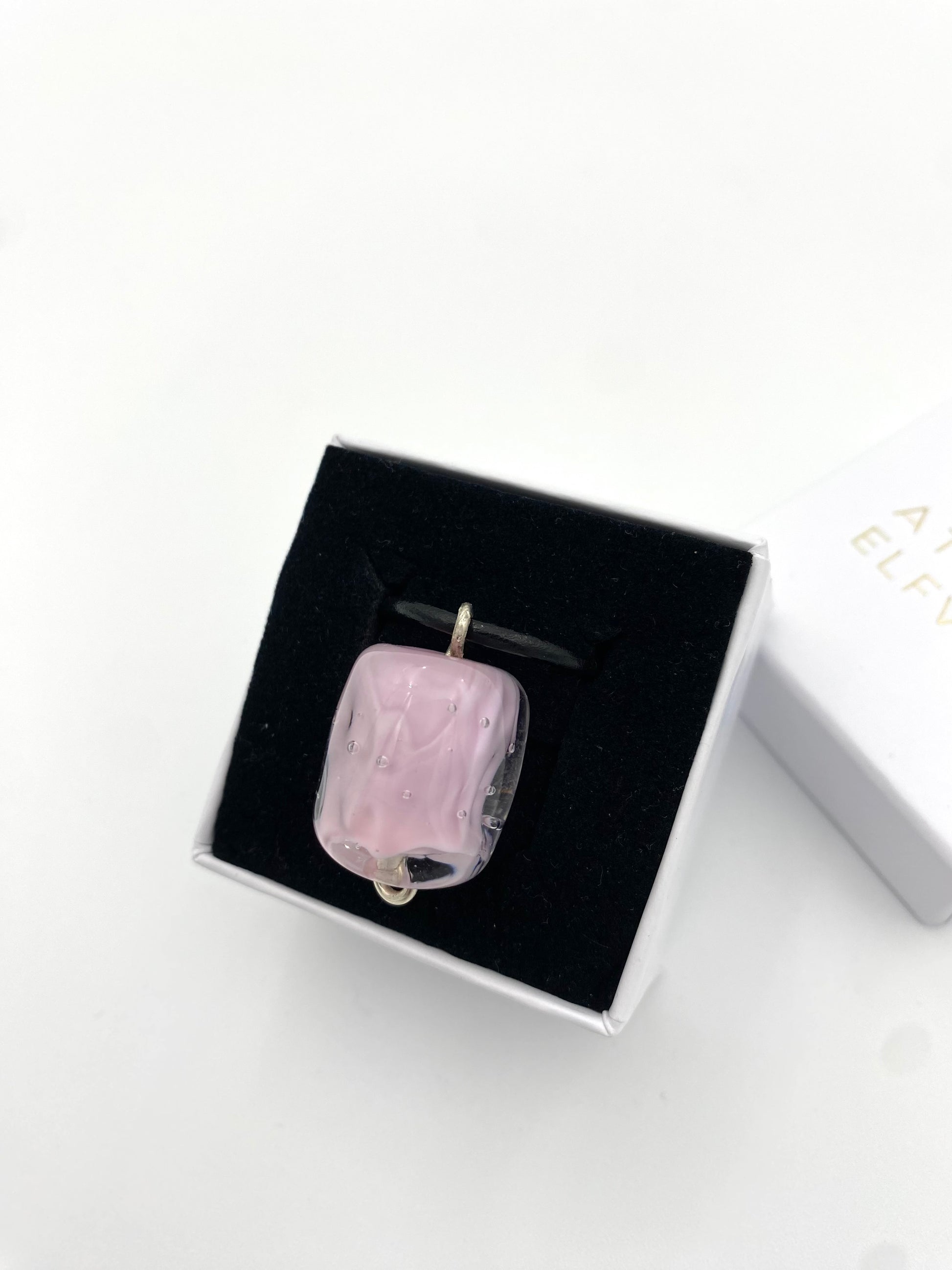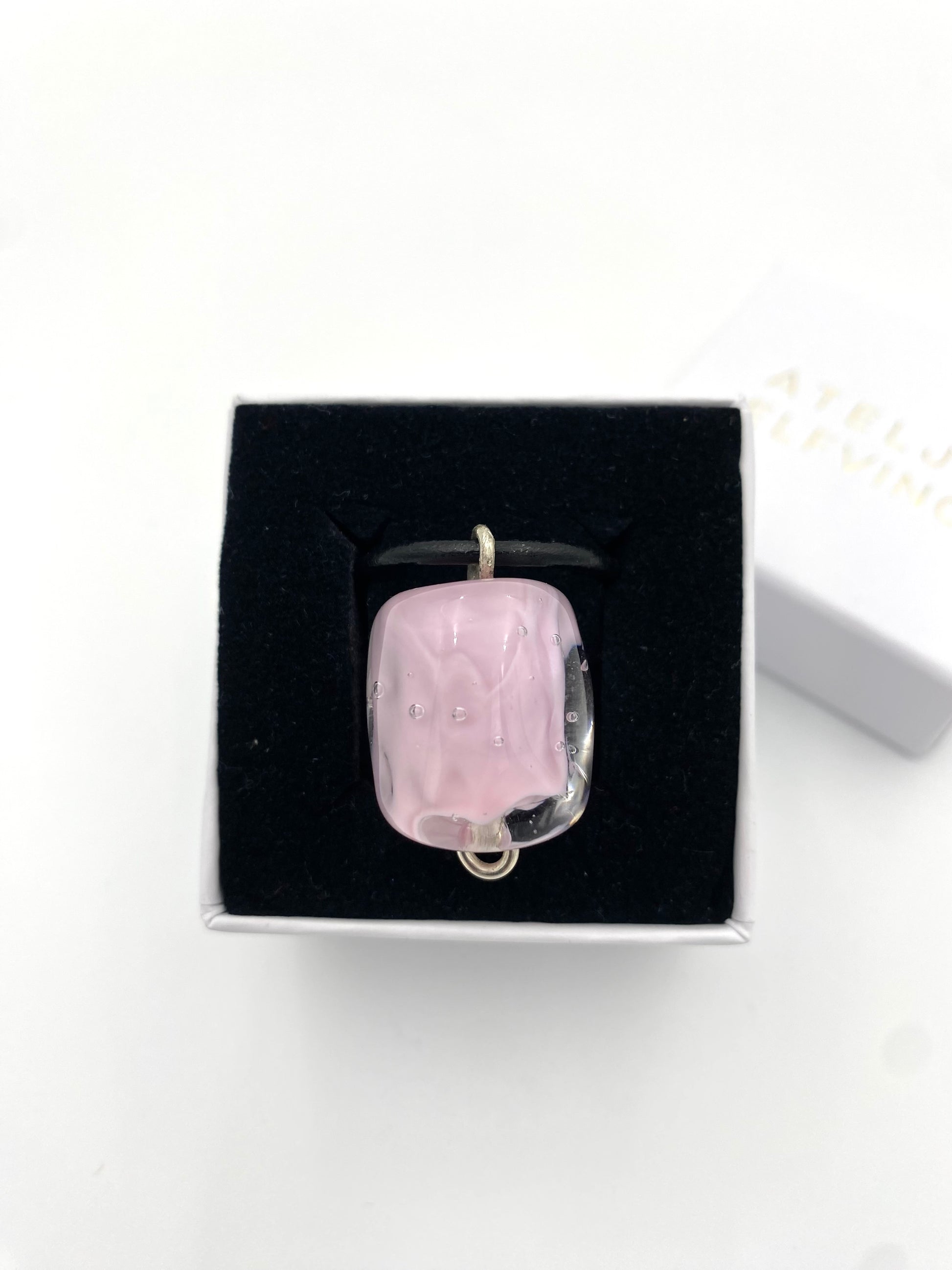 Rosa pärla med klarglas över. 3 cm. hög, 2 cm, bred. Levereras med läderrem.