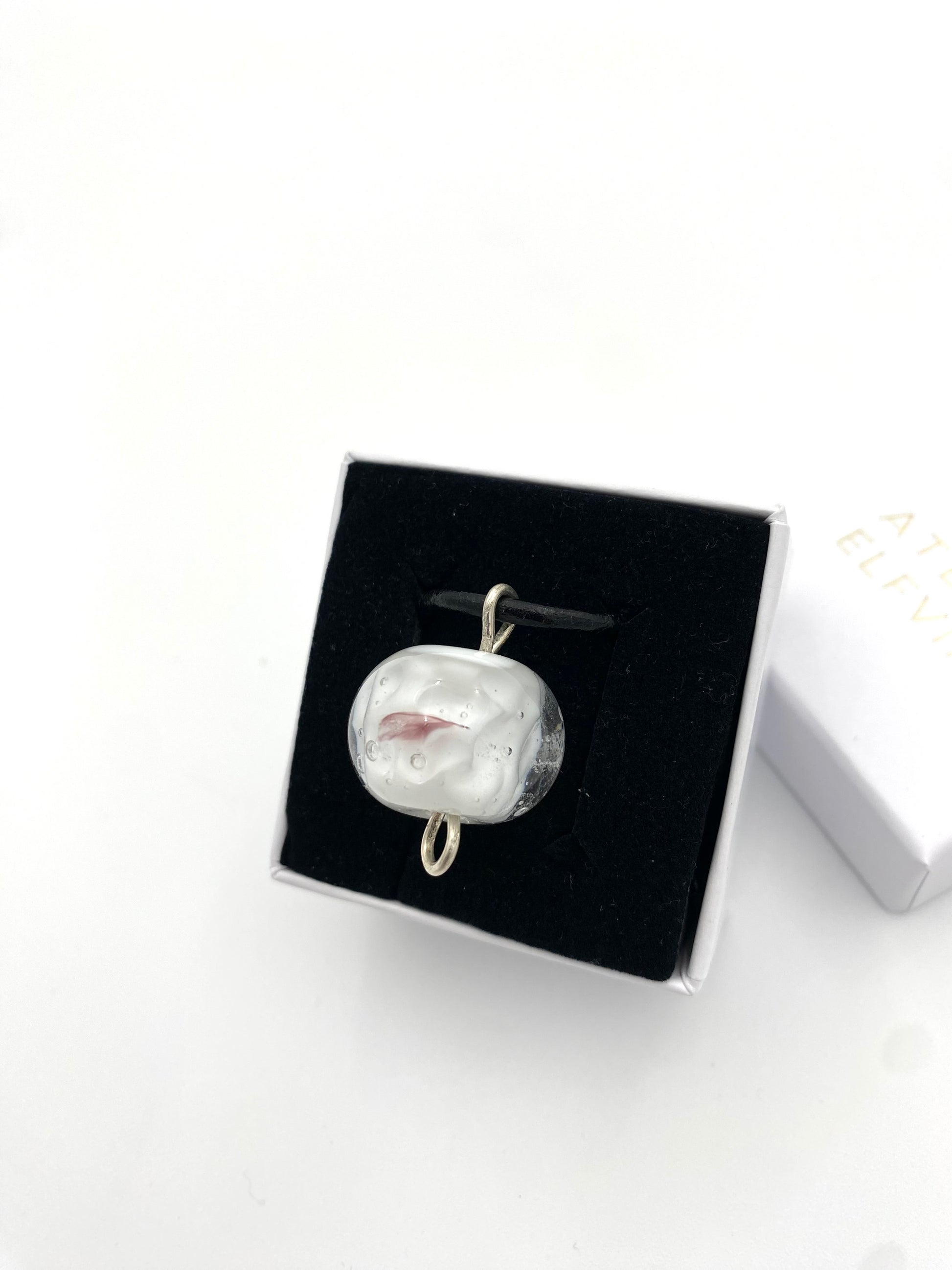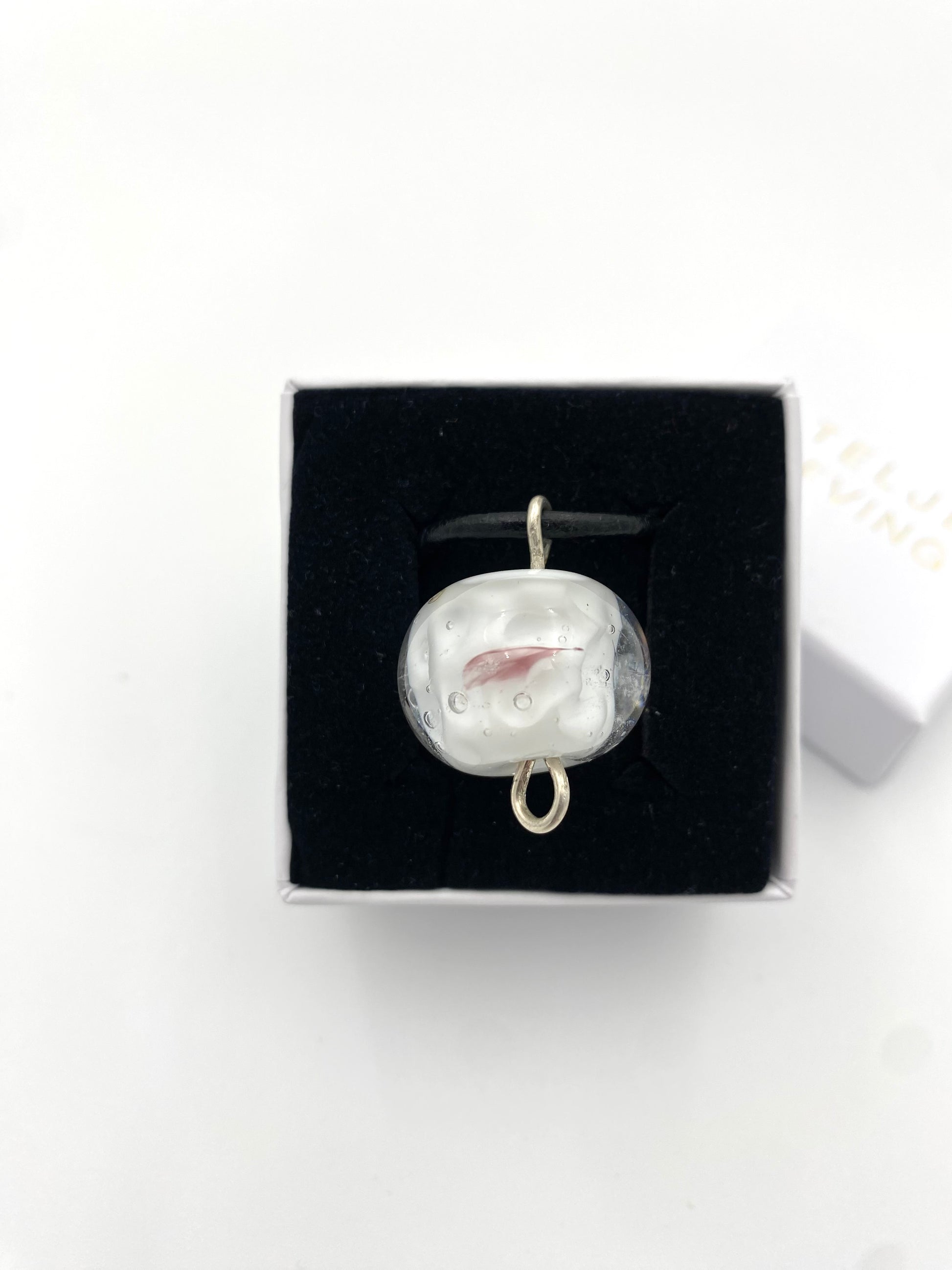 Vit pärla med klarglas på och en liten lila detalj. 2 cm. hög, 2 cm. bred. Levereras med läderrem.