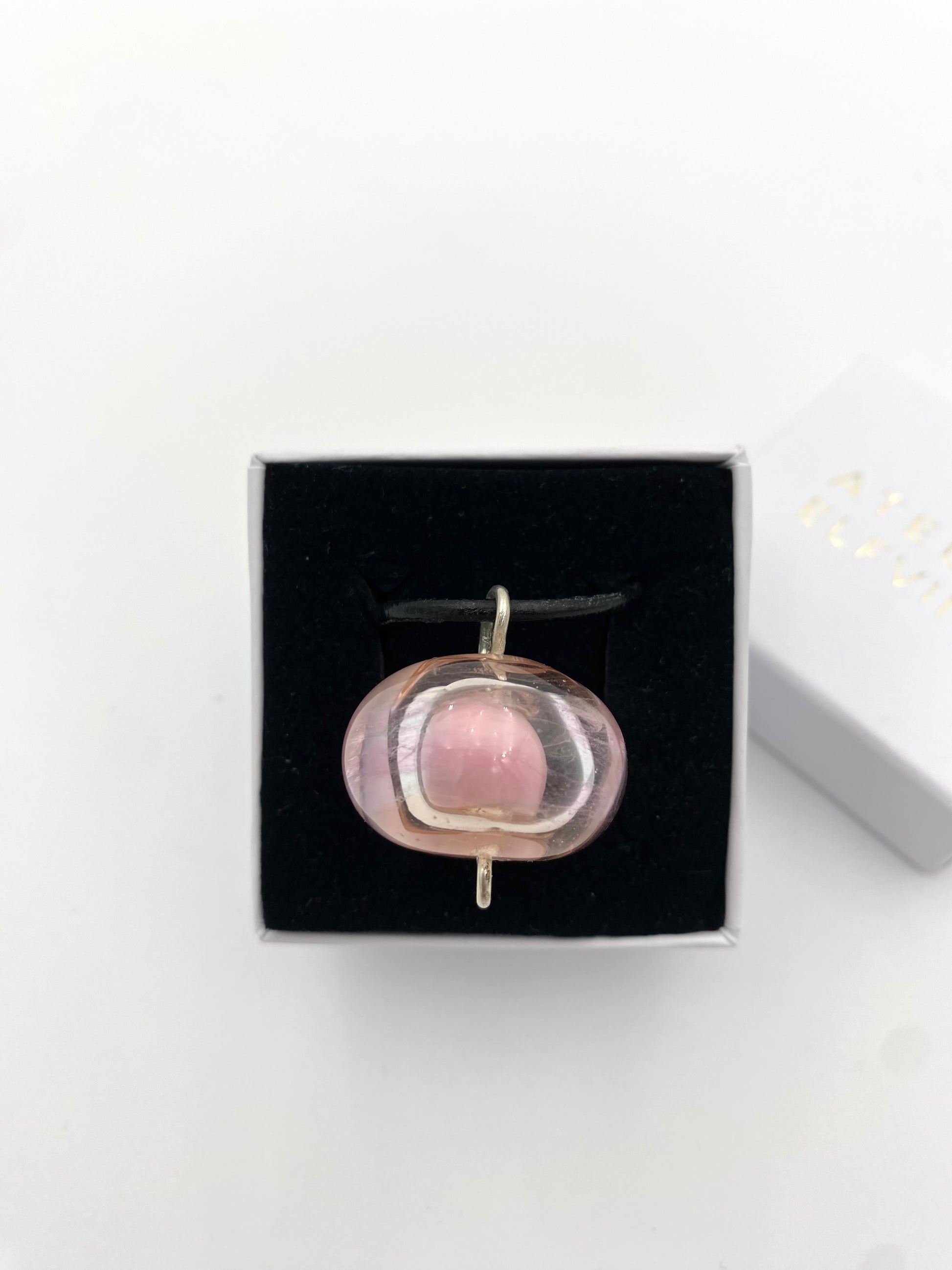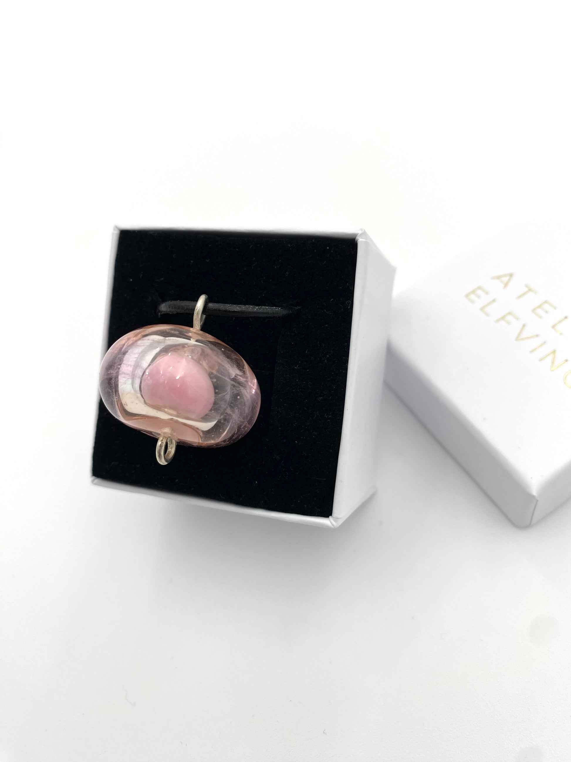 Ljusrosa pärla med klarglas på. 2.5 cm. hög, 2.5 cm. bred. Levereras med läderrem.