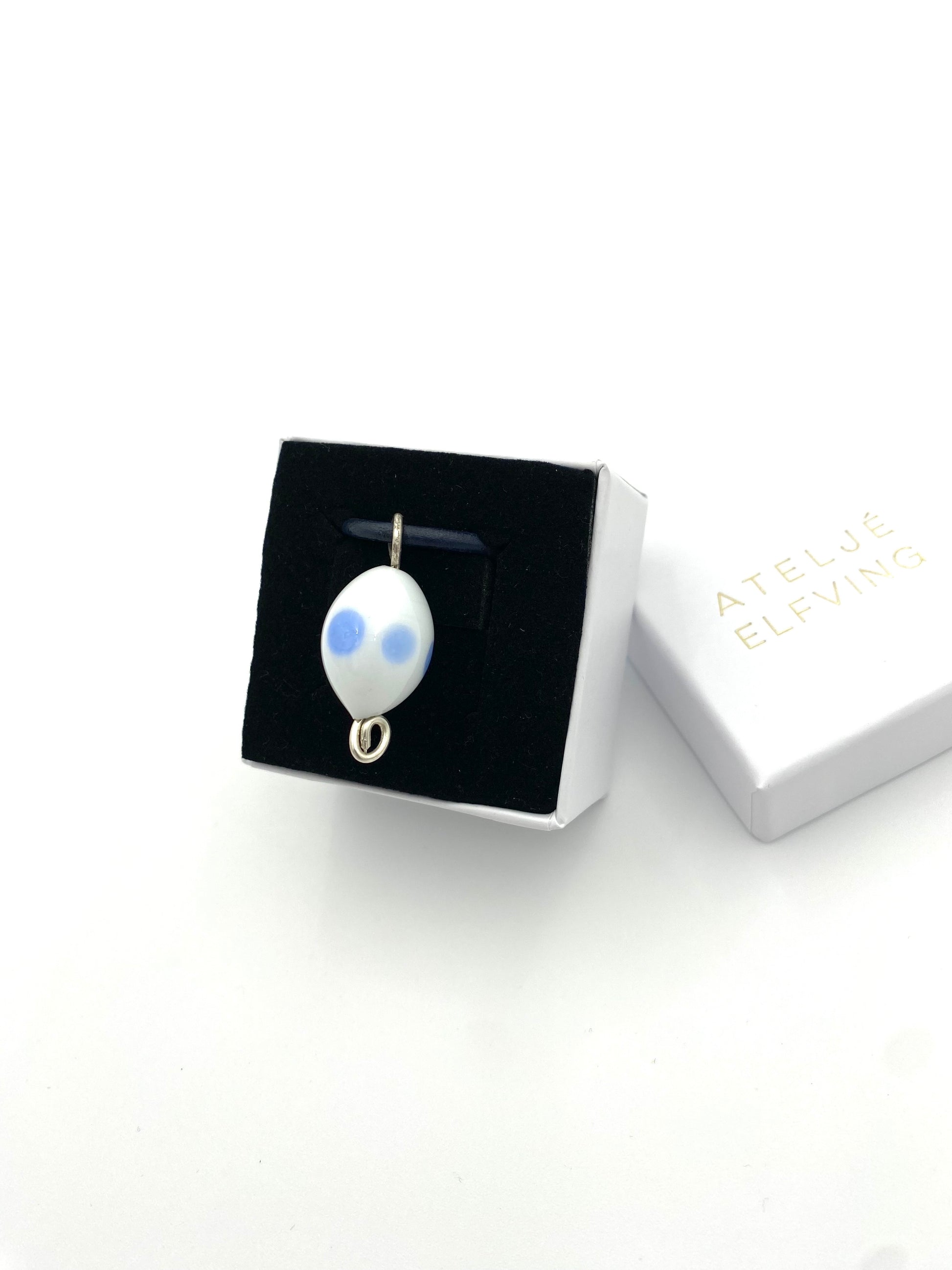Vit pärla med ljusblå cirklar. 3 cm. hög, 1.5 cm. bred. Levereras med läderrem.