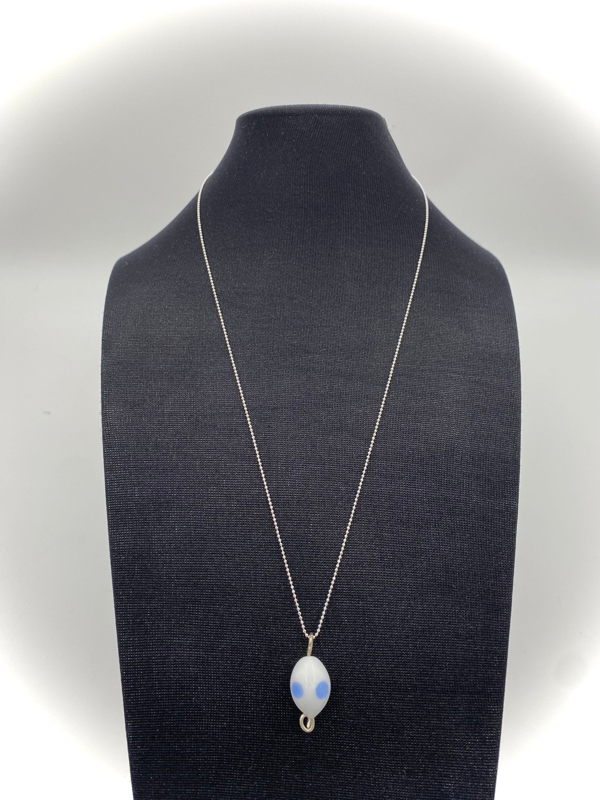 Vit pärla med ljusblå cirklar. 3 cm. hög, 1.5 cm. bred. 1.2 mm kulkedja med lås 60 cm sterling silver medföljer. Levereras i smyckesask.