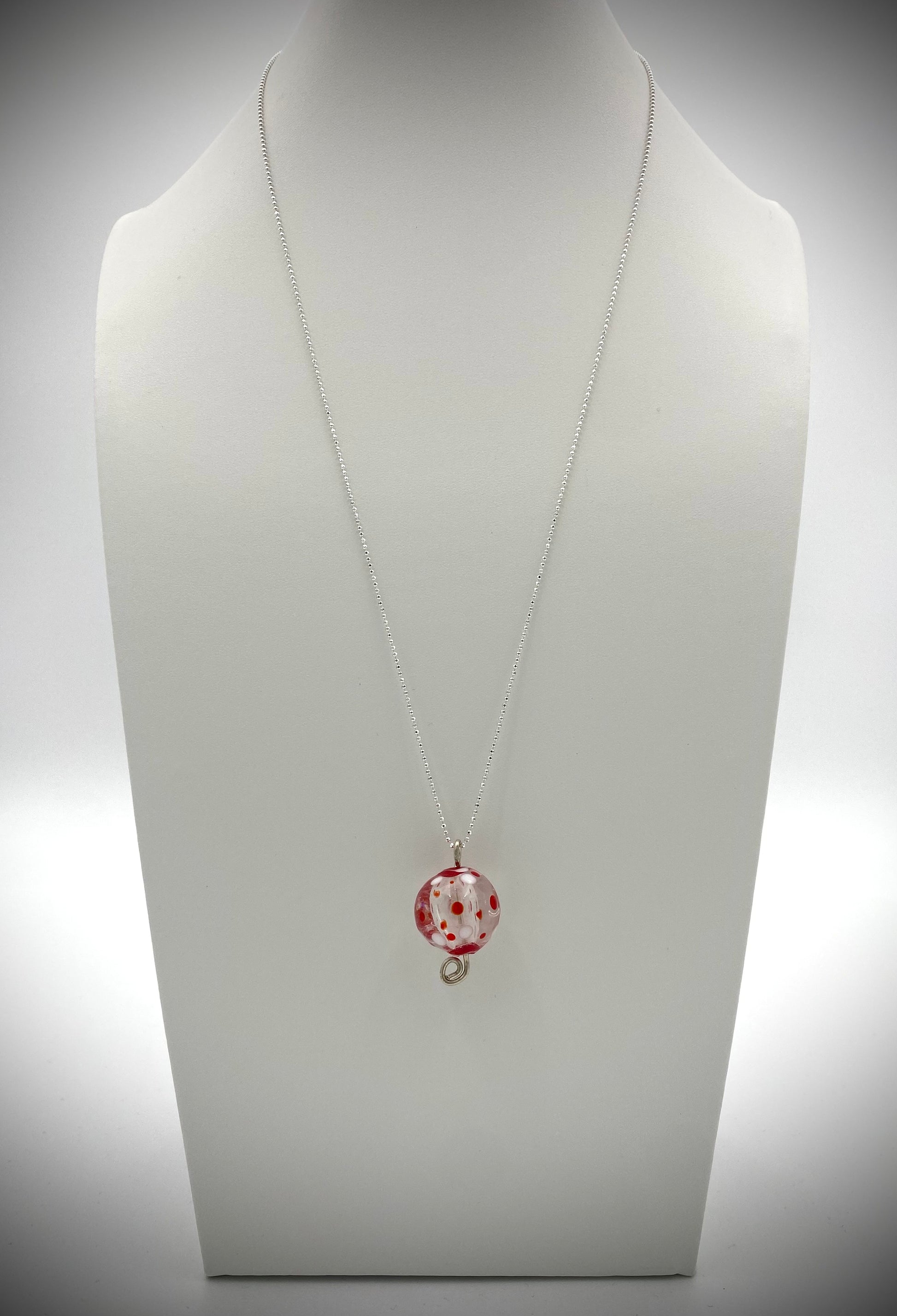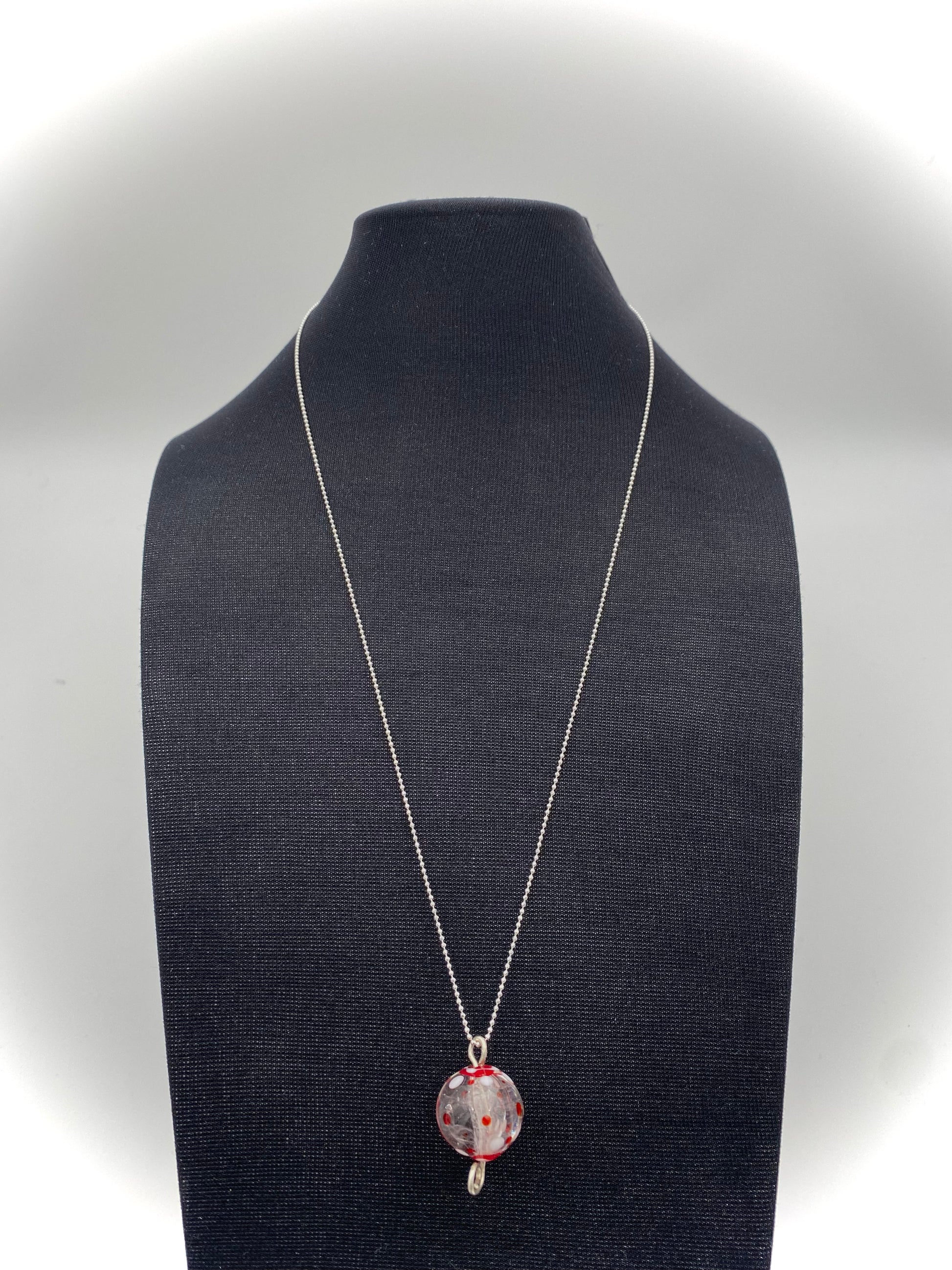 Klarglas "ballongpärla" med vita och röda prickar. 3 cm. hög, 2 cm. bred. 1.2 mm kulkedja med lås 60 cm sterling silver medföljer. Levereras i smyckesask.
