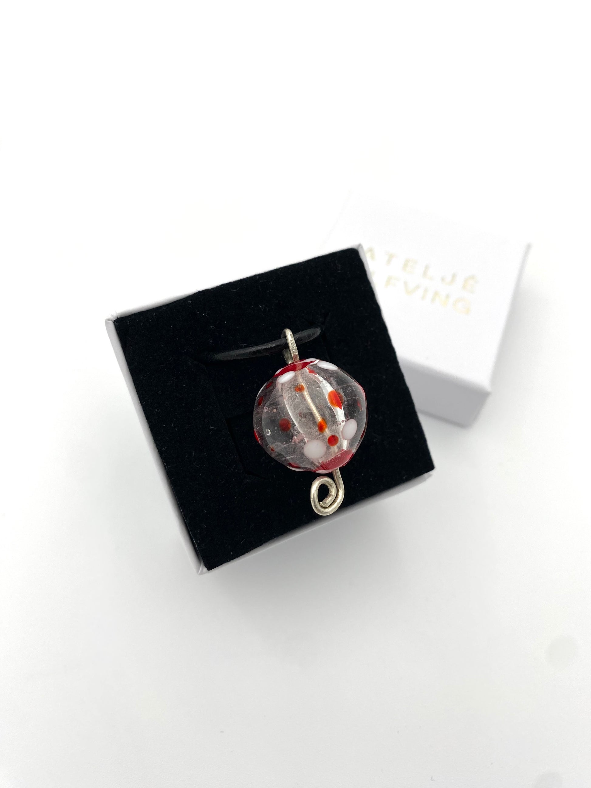 Klarglas "ballongpärla" med vita och röda prickar. 3 cm. hög, 2 cm. bred. Levereras med läderrem.
