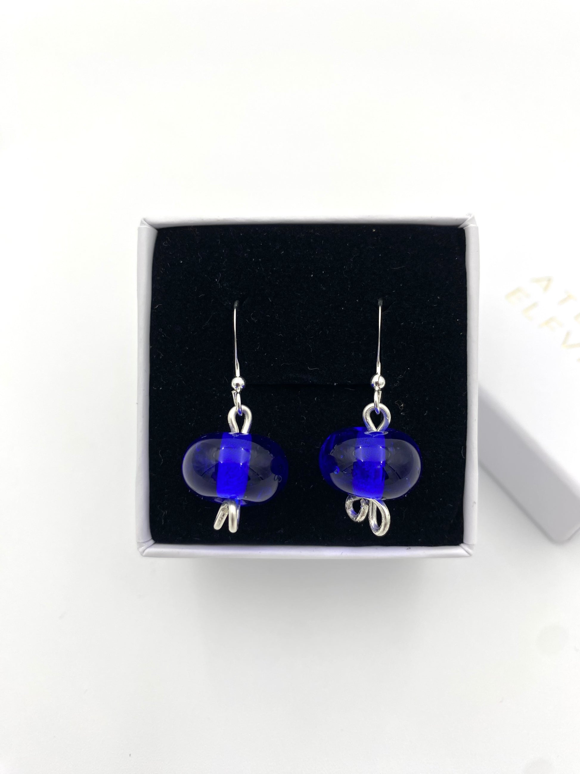 Mörkblåa lampworkpärlor. Hänge med pärla cirka 3 cm. lång.
