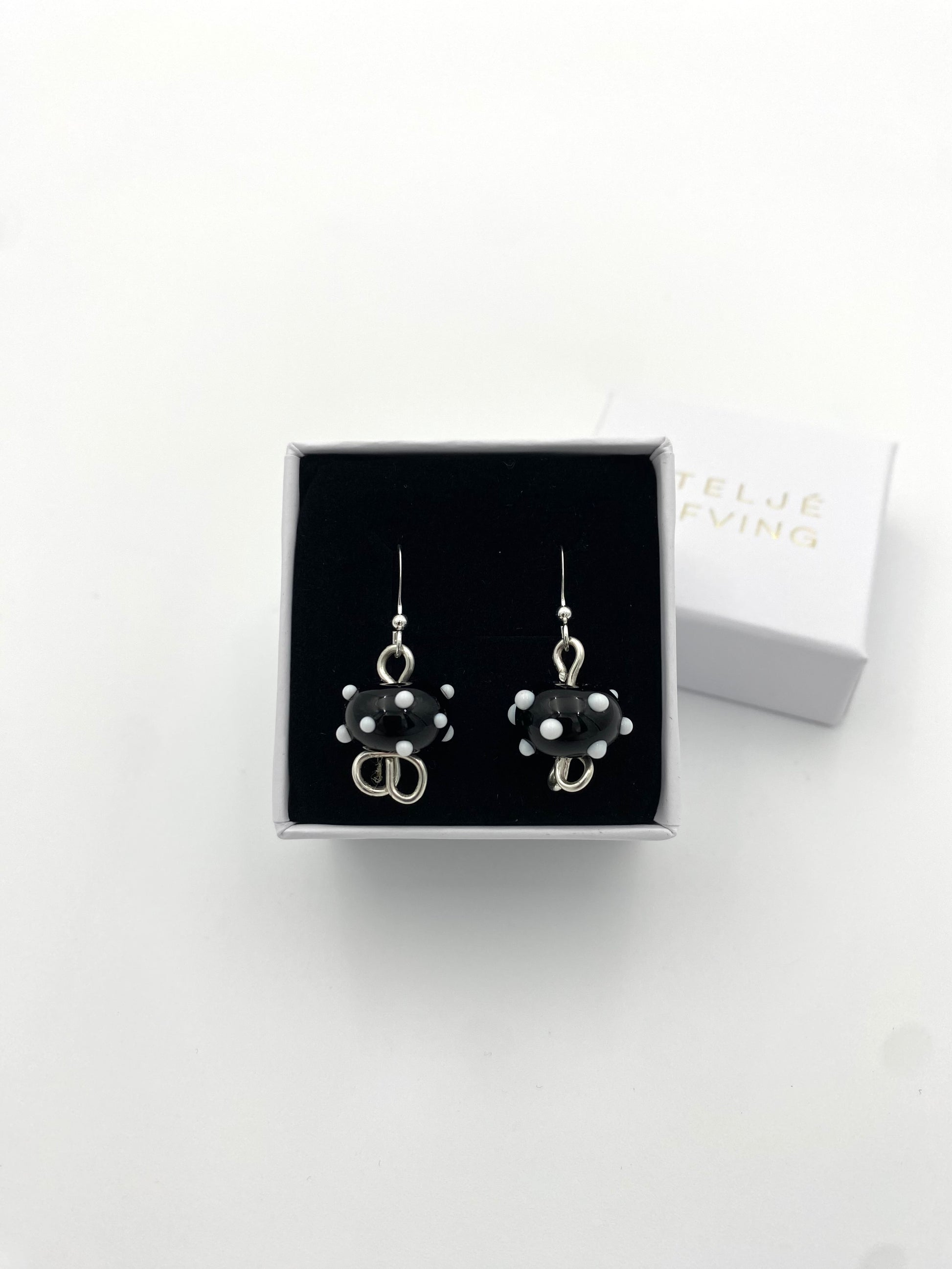 Svarta lampworkpärlor med vita prickar. Hänge med pärlan cirka 3 cm. lång.