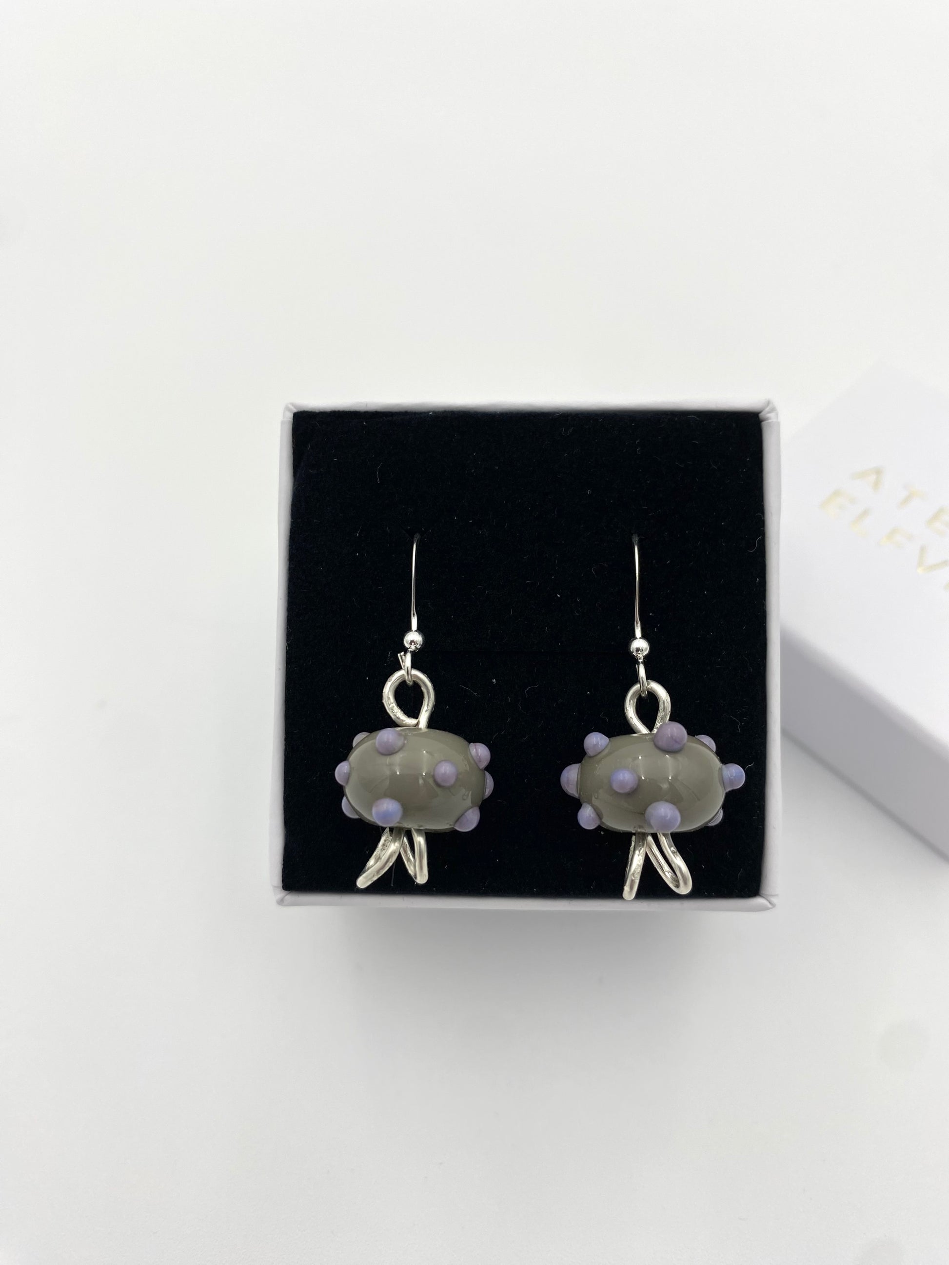 Ljusgråa lampworkpärlor med lila prickar. Hänge med pärlan cirka 3 cm. lång.