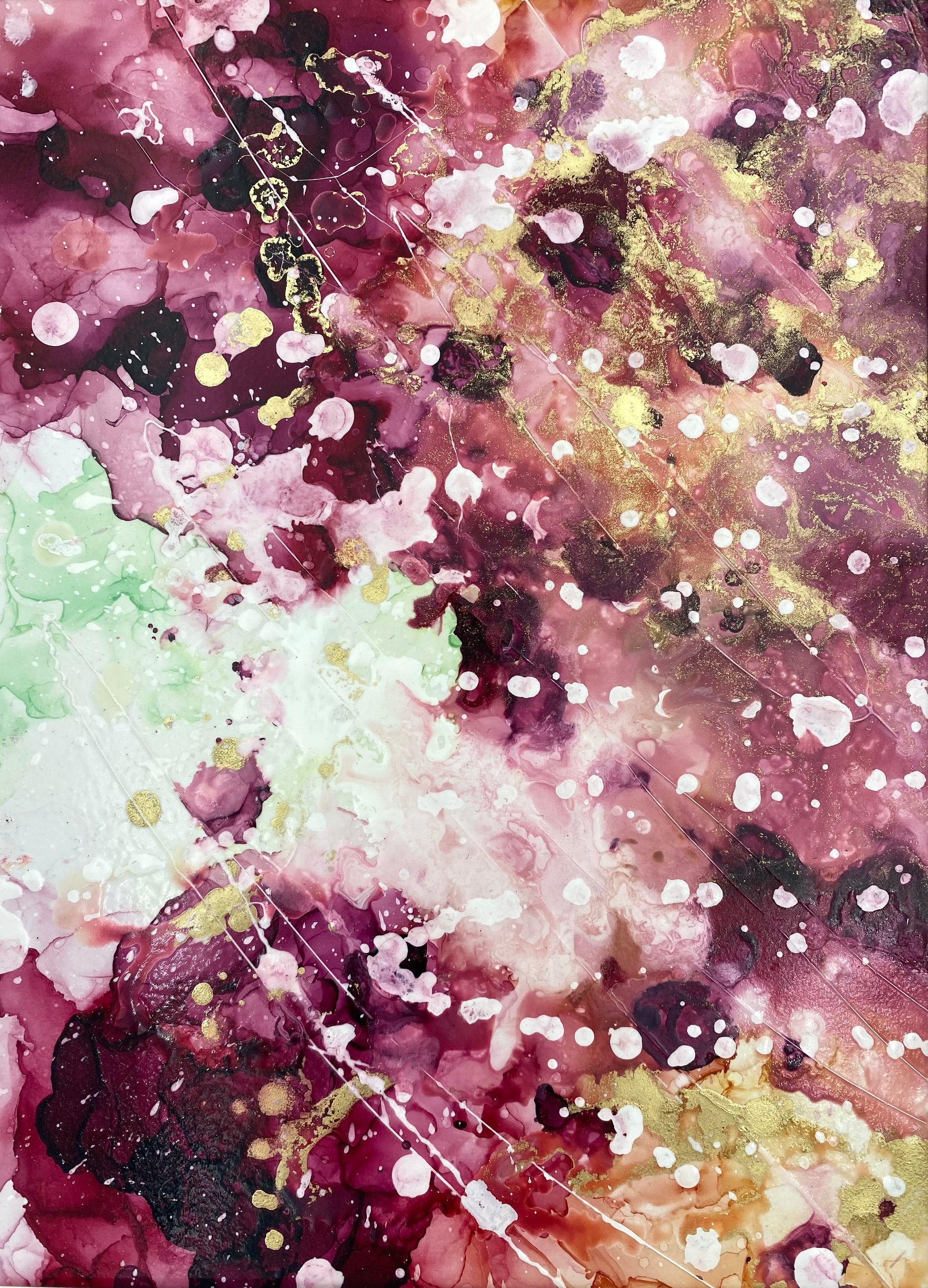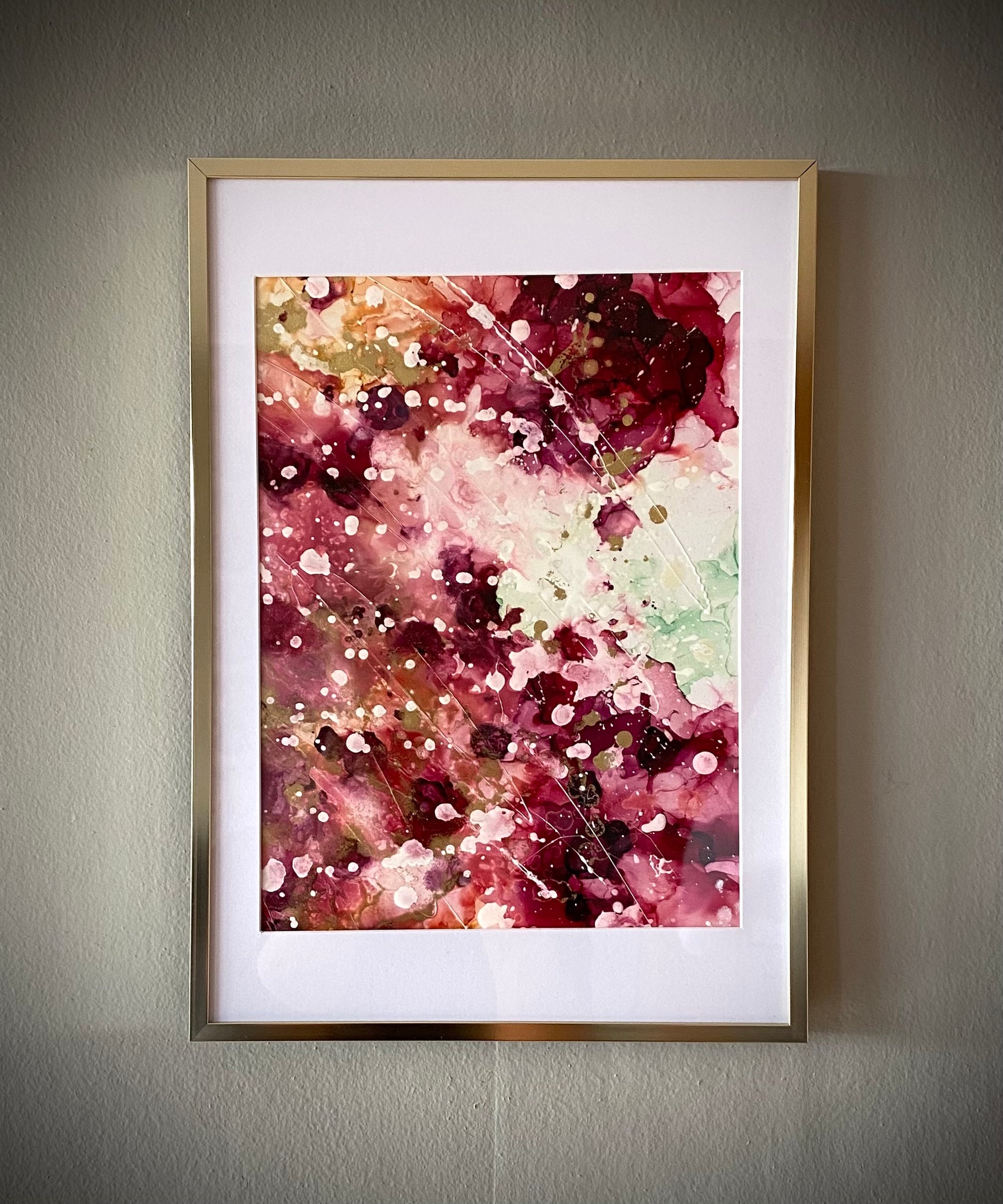 Tavla i alkoholbläck. Guldfärgad ram 30x20 cm. Målningen med passepartout 24x17 cm.