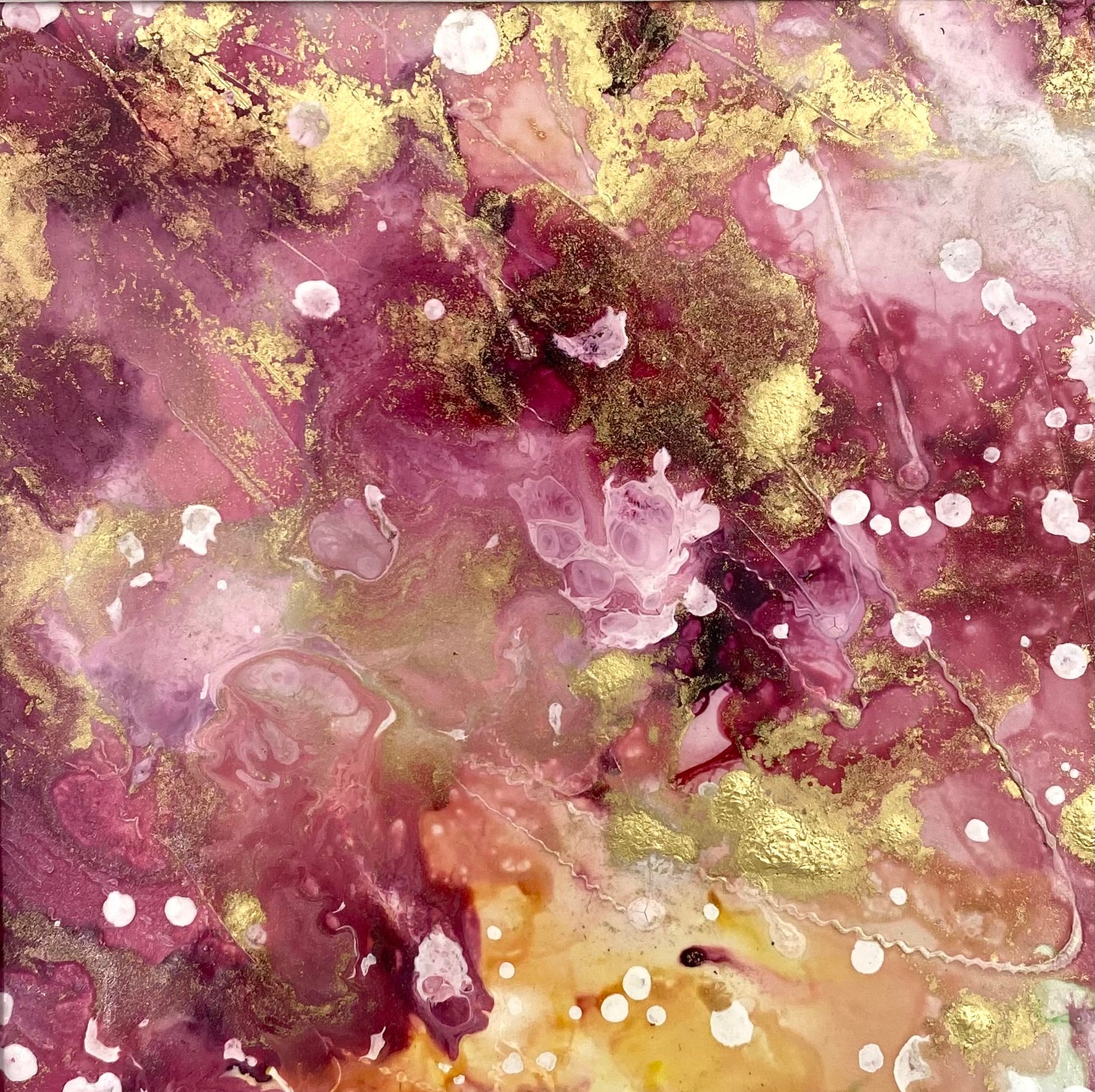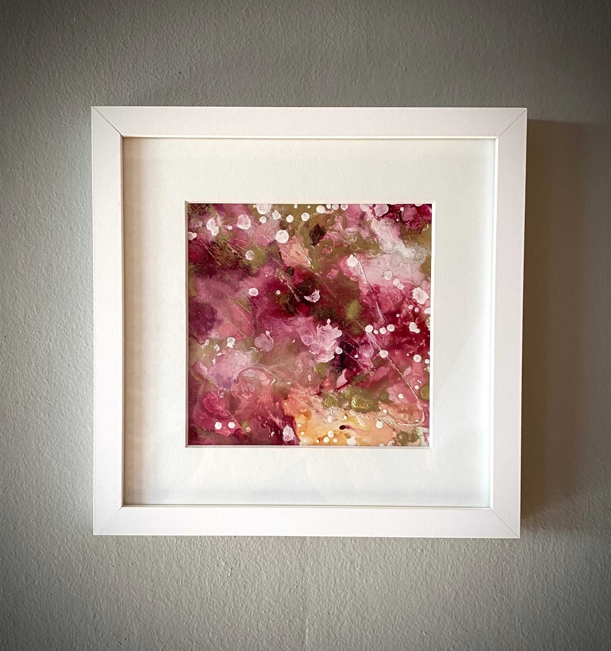 Tavla i alkoholbläck. Vit ram 20x20 cm. Målningen med passepartout 11.5x11.5 cm.