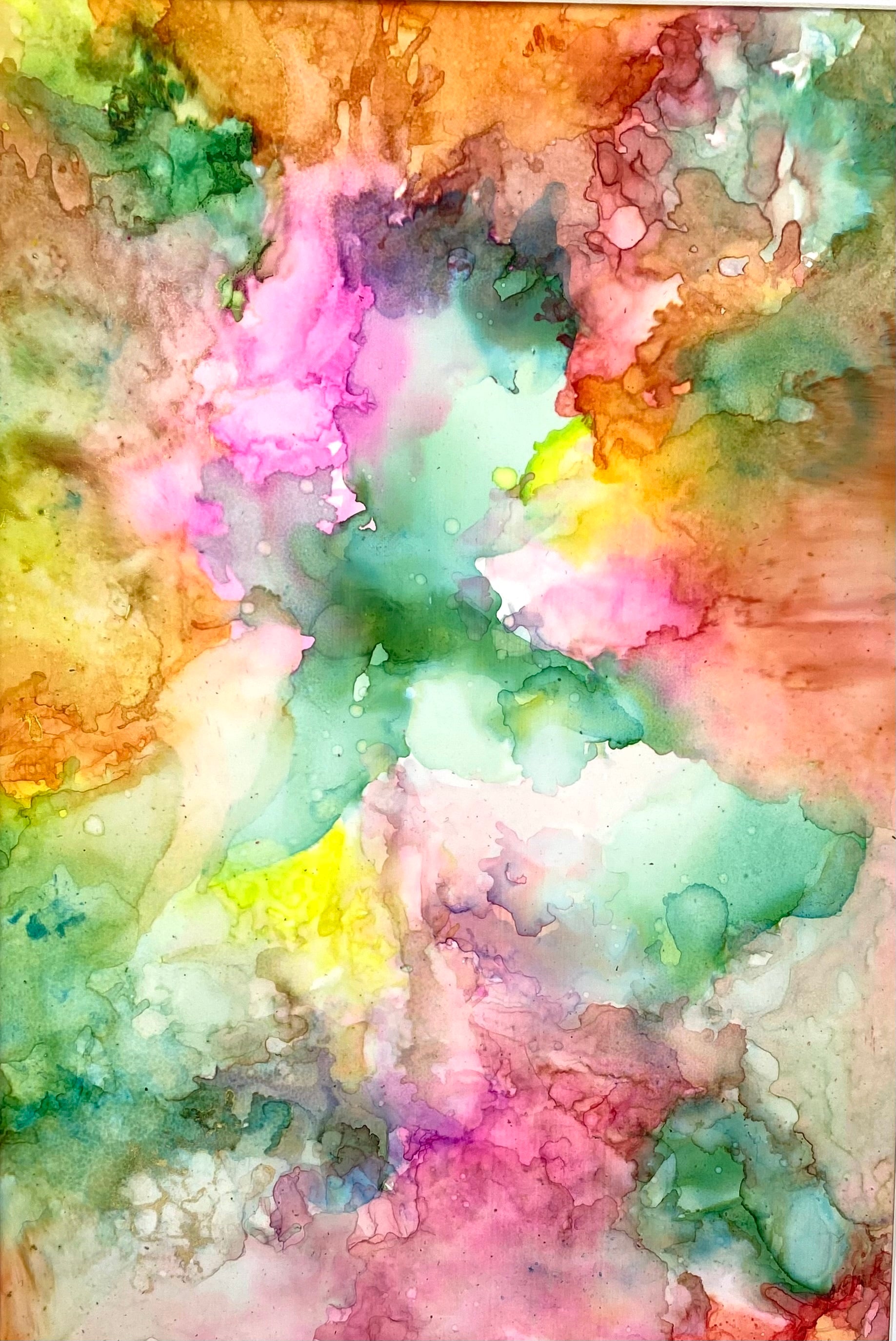 Tavlan är gjord av alkoholbläck på ett syntetiskt papper. Jag blåser runt färgerna och när jag börjar med ett tomt papper vet jag aldrig hur det färdiga resultatet ska komma att se ut. Just det gör det extra spännande och roligt. Härliga färgkombinationer uppstår under tiden det färdiga resultatet växer fram. När kompositionen känns perfekt skyddas den med nio lager lack för långvarig hållbarhet och skydd mot UV-ljus. Varje tavla är ett unikt kontsverk som aldrig kan återskapas.