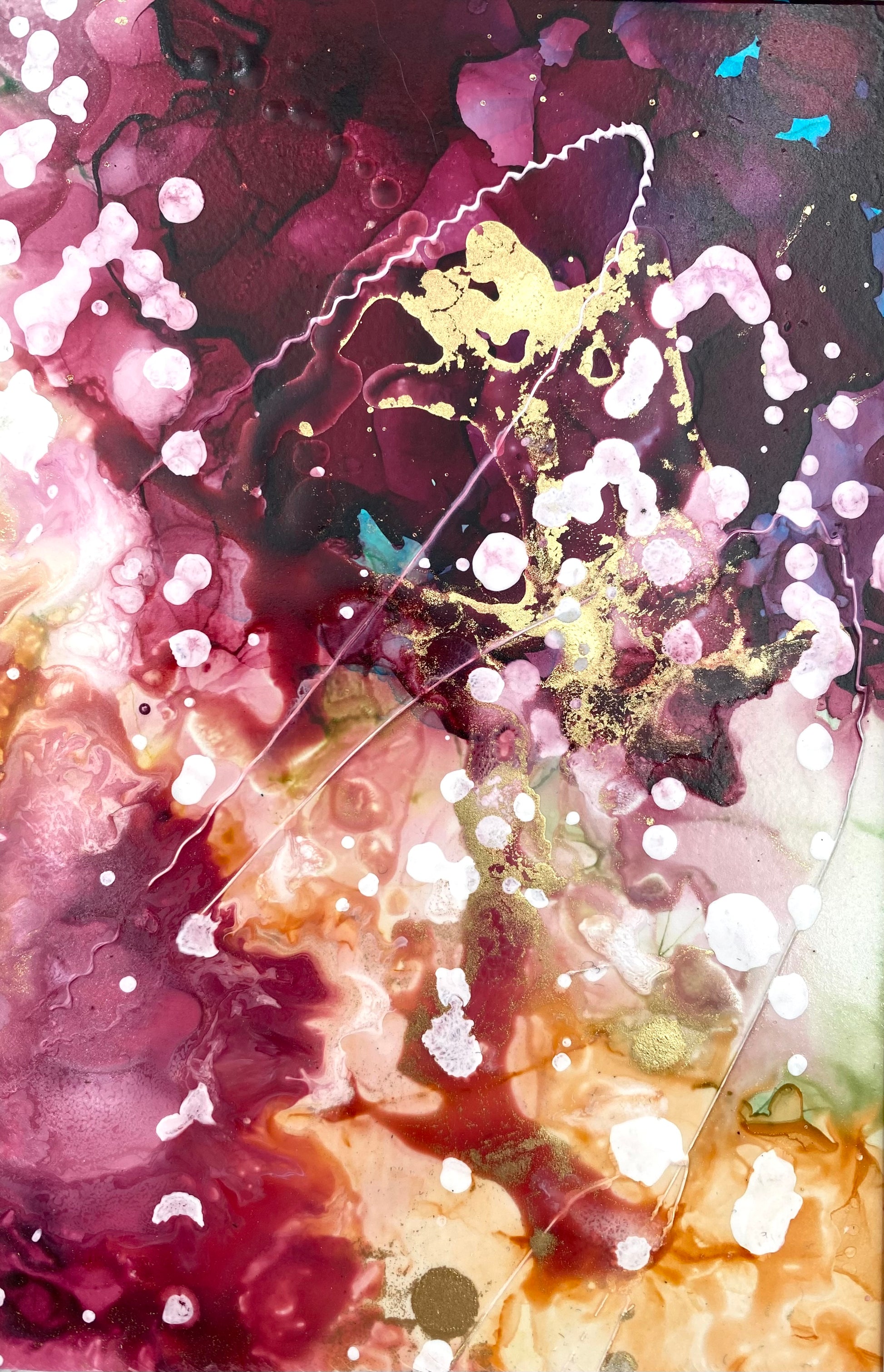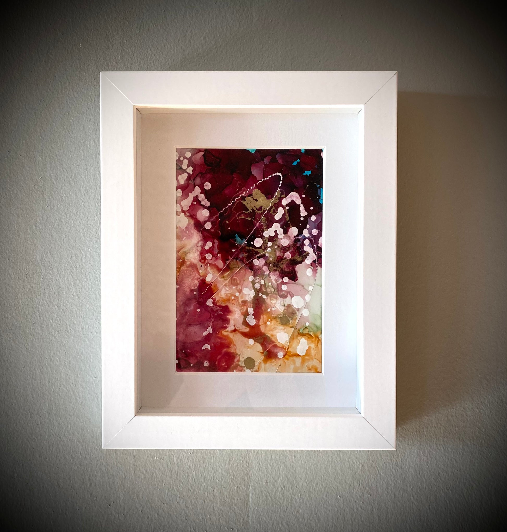 Tavla i alkoholbläck. Vit djup ram 23x18 cm. Målningen med passepartout 14x10 cm.