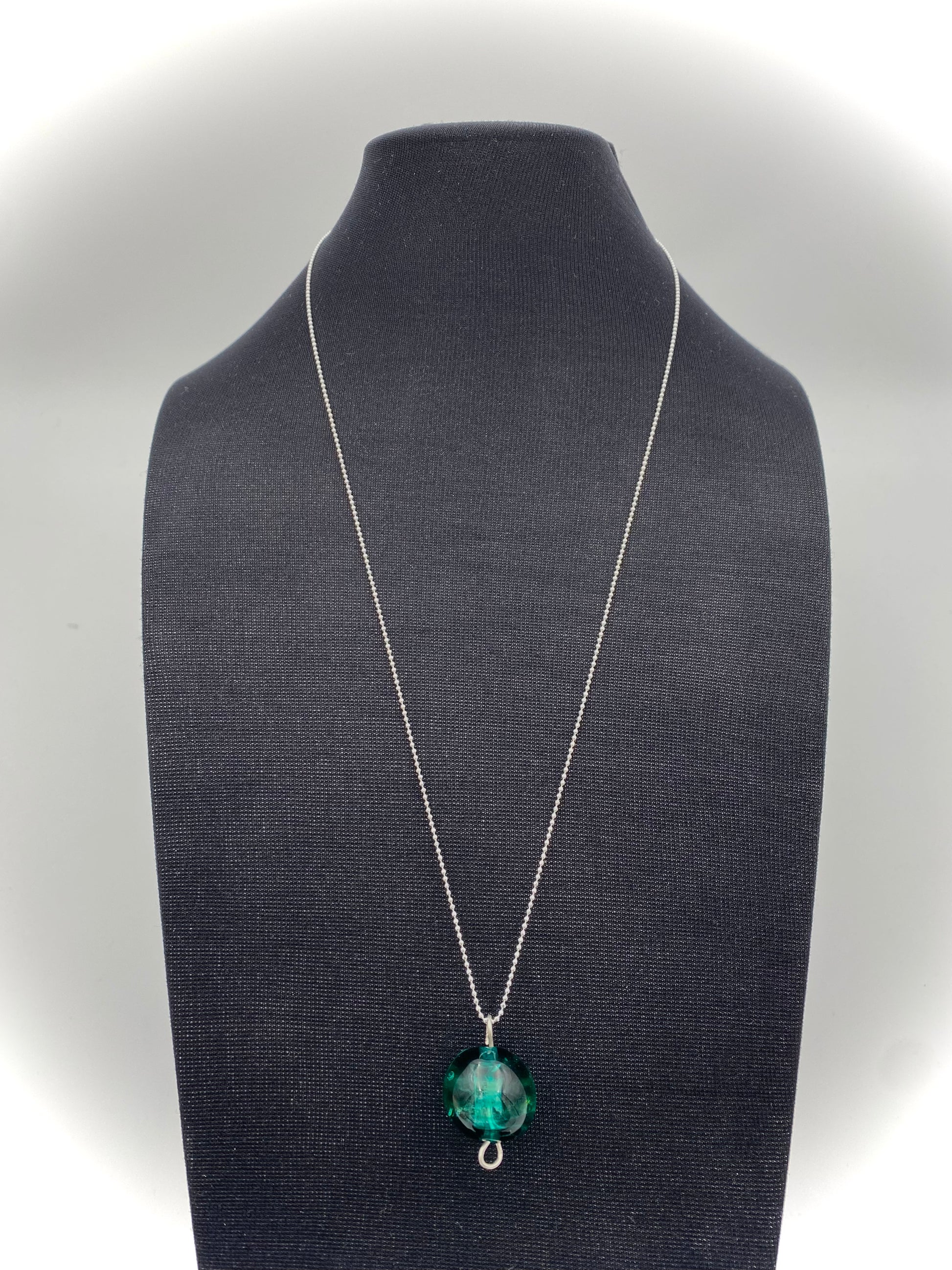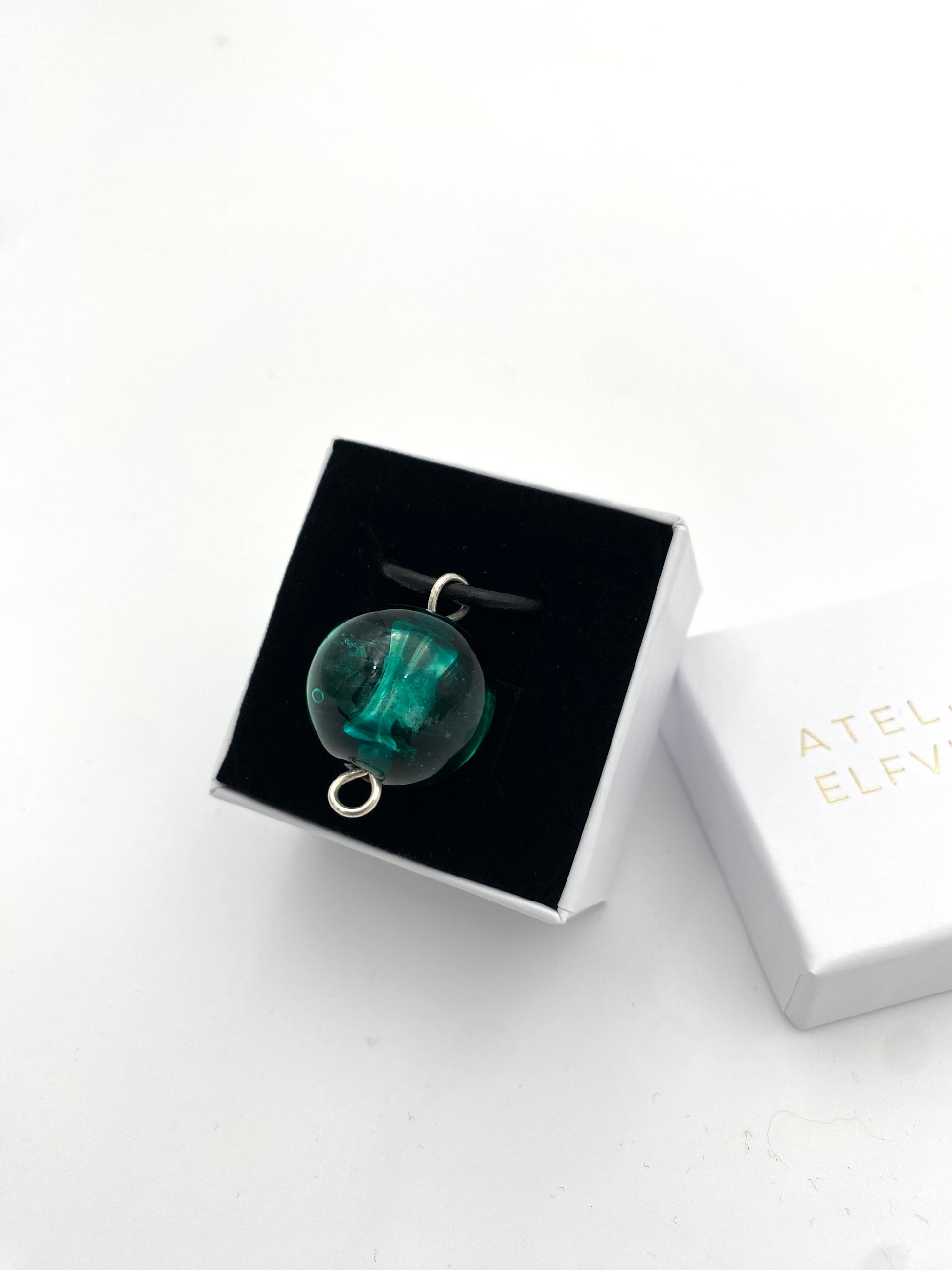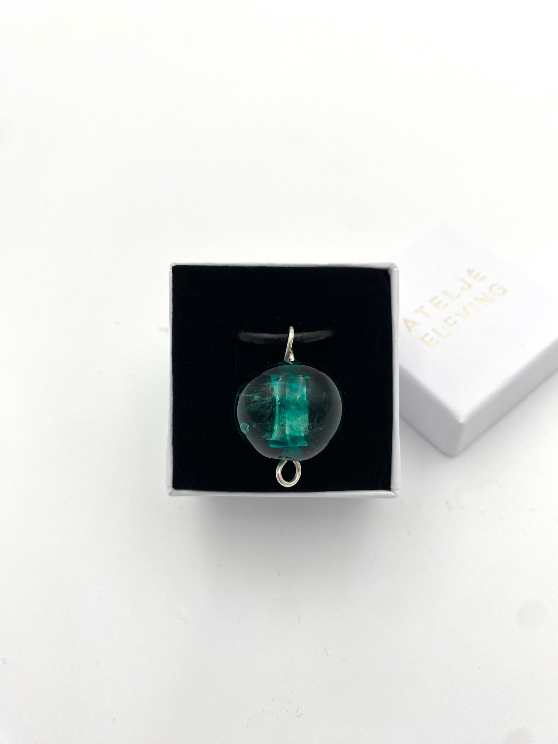 Turkosgrön ihålig "ballongpärla". 3 cm. hög, 2 cm. bred. 1.2 mm kulkedja med lås 60 cm sterling silver medföljer. Levereras i smyckesask.